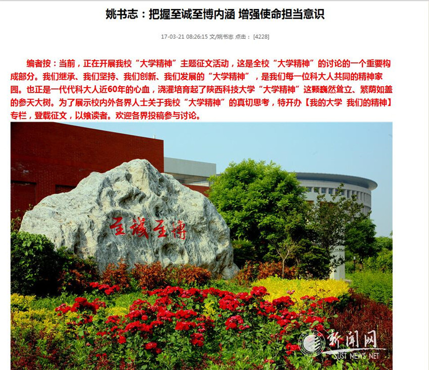 “大學(xué)精神是一個(gè)大學(xué)的精神烙印,我校大學(xué)精神離不開一代代科大人在建校、搬遷過程中展現(xiàn)的自強(qiáng)不息精神與三實(shí)作風(fēng),以及跟隨時(shí)代變遷與時(shí)俱進(jìn)謀求發(fā)展的精神,需要在集思廣益基礎(chǔ)上,不斷深挖、提煉、發(fā)揚(yáng)?!?/p>