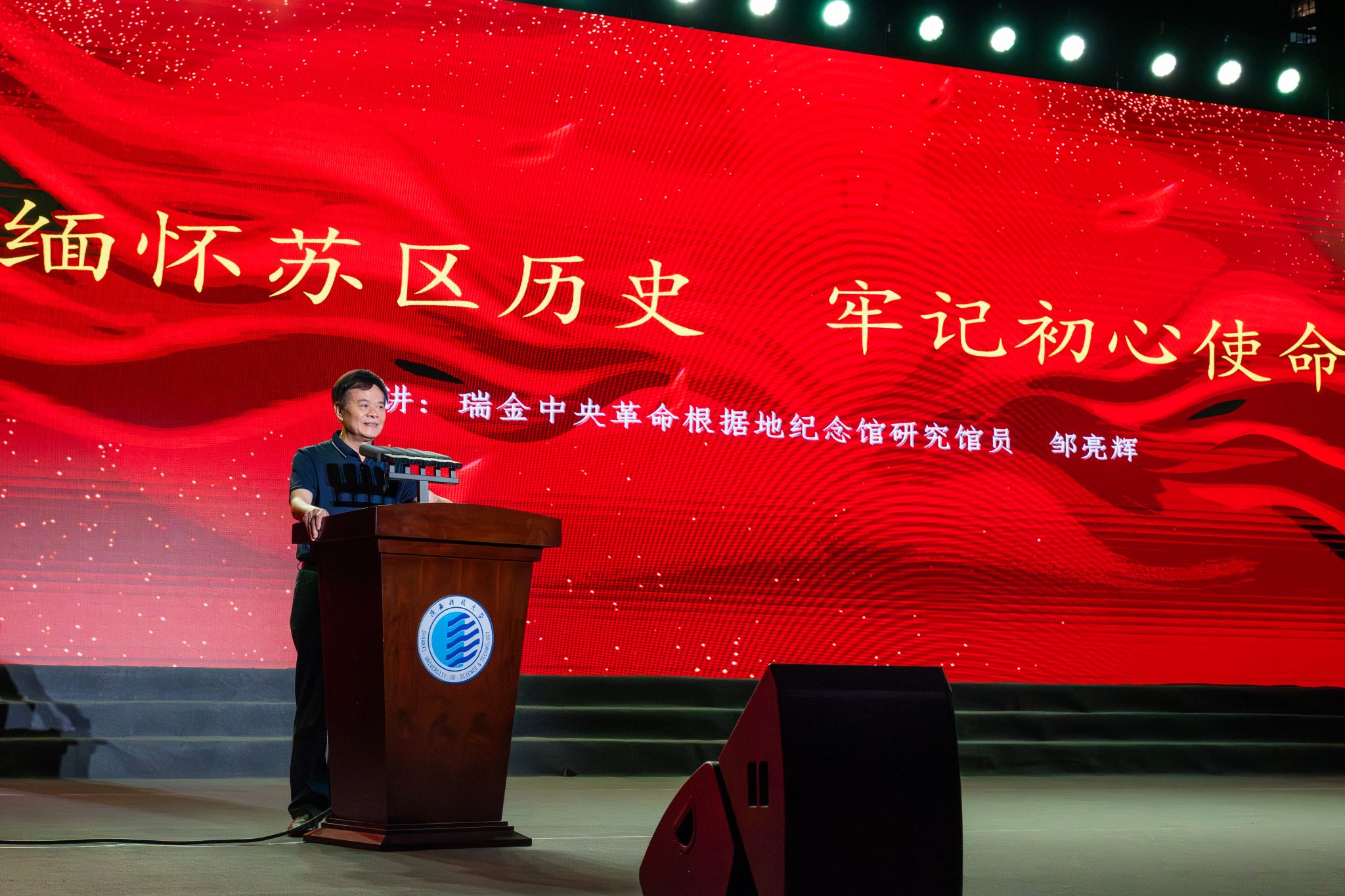 活動(dòng)最后,瑞金中央革命根據(jù)地紀(jì)念館原館長(zhǎng)、研究員鄒亮輝以《緬懷蘇區(qū)歷史,牢記初心使命》為題作專(zhuān)題報(bào)告,從追尋中國(guó)紅色政權(quán)之源,中央蘇區(qū)的形成與發(fā)展,中央蘇區(qū)的喪失和奉獻(xiàn),不忘初心、牢記使命的精神內(nèi)涵等四部分生動(dòng)講述了中央蘇區(qū)的歷史,對(duì)蘇區(qū)精神的內(nèi)涵和傳承進(jìn)行了深入詮釋。
