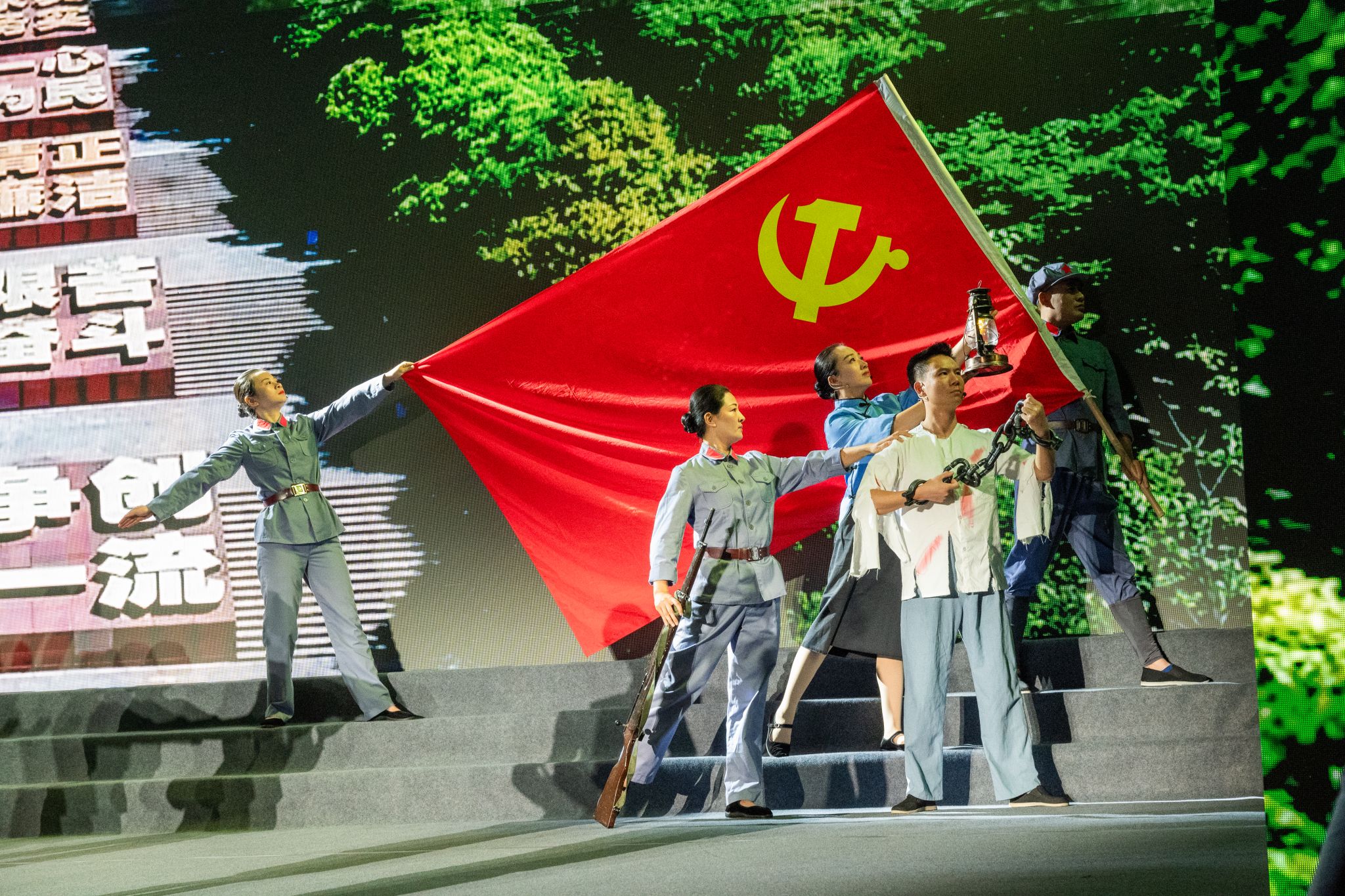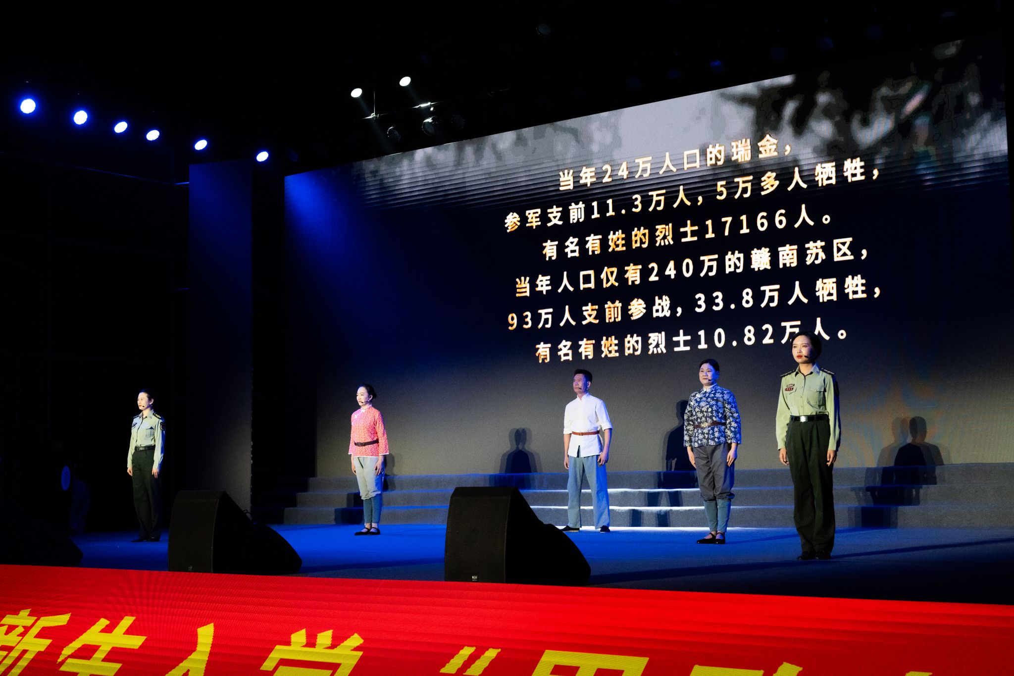 活動(dòng)現(xiàn)場(chǎng),瑞金中央革命根據(jù)地紀(jì)念館演職人員為2024級(jí)全體新生帶來(lái)了精心編排的《蘇區(qū)精神永放光芒》大思政課紅色情景故事展演。展演以發(fā)生在中央蘇區(qū)的紅色故事為主體,融深情講演、情景再現(xiàn)、舞臺(tái)特效、配樂(lè)渲染等多種藝術(shù)表現(xiàn)形式于一體,重點(diǎn)演繹了“伯堅(jiān)就義”“紅井情深”“生守望”“十七棵松”等多個(gè)永世不朽的紅色經(jīng)典,再現(xiàn)了艱苦卓絕的蘇區(qū)歲月,重溫了氣吞山河的英雄事跡,讓全體新生在沉浸式的大思政課中感悟蘇區(qū)精神、砥礪思想靈魂。