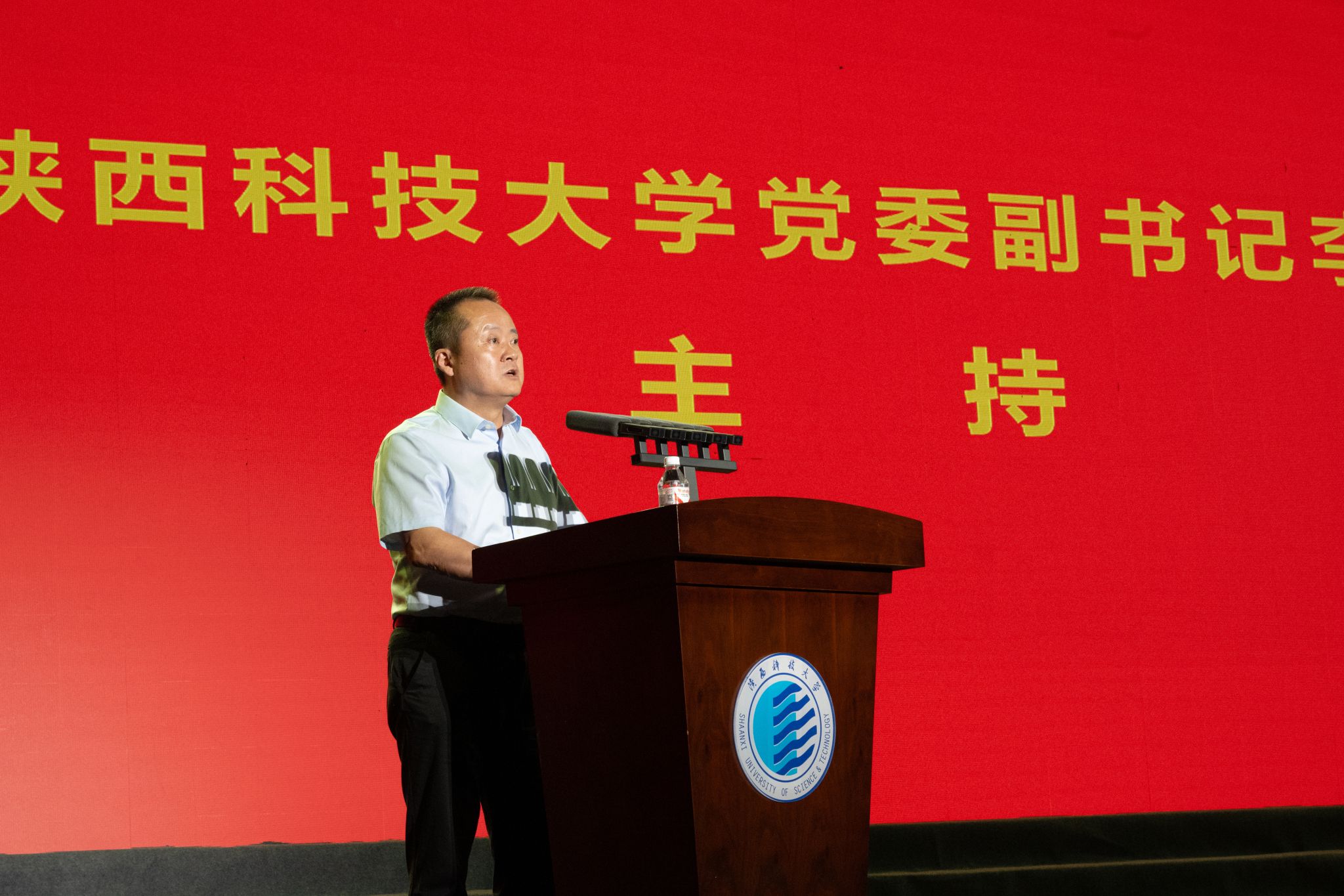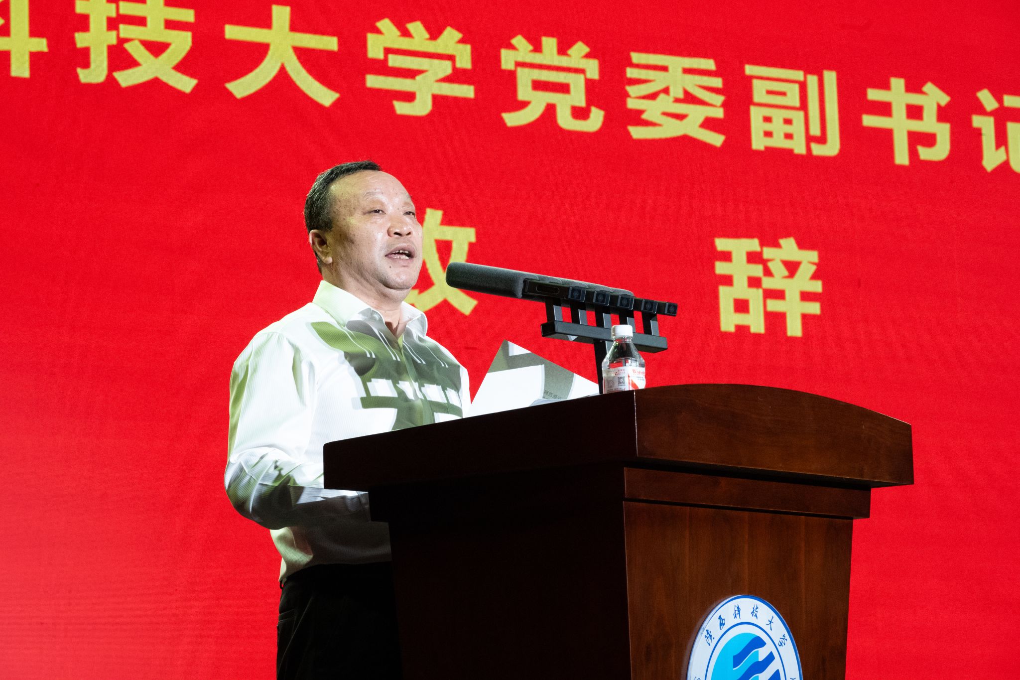 王道安在致辭中對(duì)瑞金市委市政府、瑞金中央革命根據(jù)地紀(jì)念館的領(lǐng)導(dǎo)和演職人員的到來(lái)表達(dá)了真誠(chéng)的感謝。他回顧了黨領(lǐng)導(dǎo)人民進(jìn)行革命的光輝歷史,指出瑞金在中國(guó)革命史上具有特殊重要的地位,瑞金市此行前來(lái)開(kāi)展校館合作交流,給同學(xué)們帶來(lái)了一份寶貴的精神文化大餐。他介紹了陜西科技大學(xué)66年來(lái)的辦學(xué)歷程和取得的突出辦學(xué)成就,指出學(xué)校作為新中國(guó)第一所輕工高等學(xué)校,因輕工而生,因輕工而興,始終堅(jiān)持與新中國(guó)建設(shè)發(fā)展同向同行。在慶祝中華人民共和國(guó)成立75周年、紀(jì)念中央紅軍長(zhǎng)征出發(fā)90周年前夕,學(xué)校舉辦此次活動(dòng),就是希望通過(guò)豐富又熱烈的方式,為2024級(jí)新生上好入學(xué)“思政第一課”。希望同學(xué)們以這次活動(dòng)為契機(jī),弘揚(yáng)革命文化,傳承紅色基因,賡續(xù)紅色血脈,爭(zhēng)做堪當(dāng)民族復(fù)興重任的時(shí)代新人。
