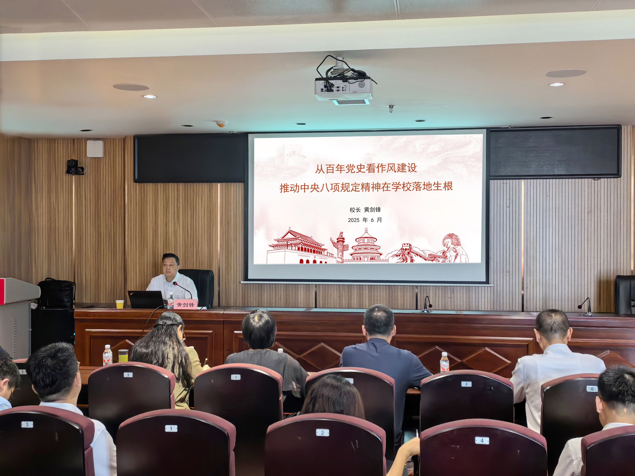 6月20日,黨委副書記、校長黃劍鋒以《從百年黨史看作風(fēng)建設(shè),推動中央八項規(guī)定精神在學(xué)校落地生根》為題,為分管(聯(lián)系)單位黨員領(lǐng)導(dǎo)干部和教務(wù)處黨支部黨員講授作風(fēng)建設(shè)專題黨課。