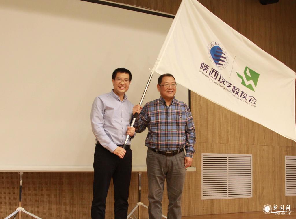 王樹茂教授向劉專琦授陜西設(shè)藝校友會(huì)會(huì)旗。