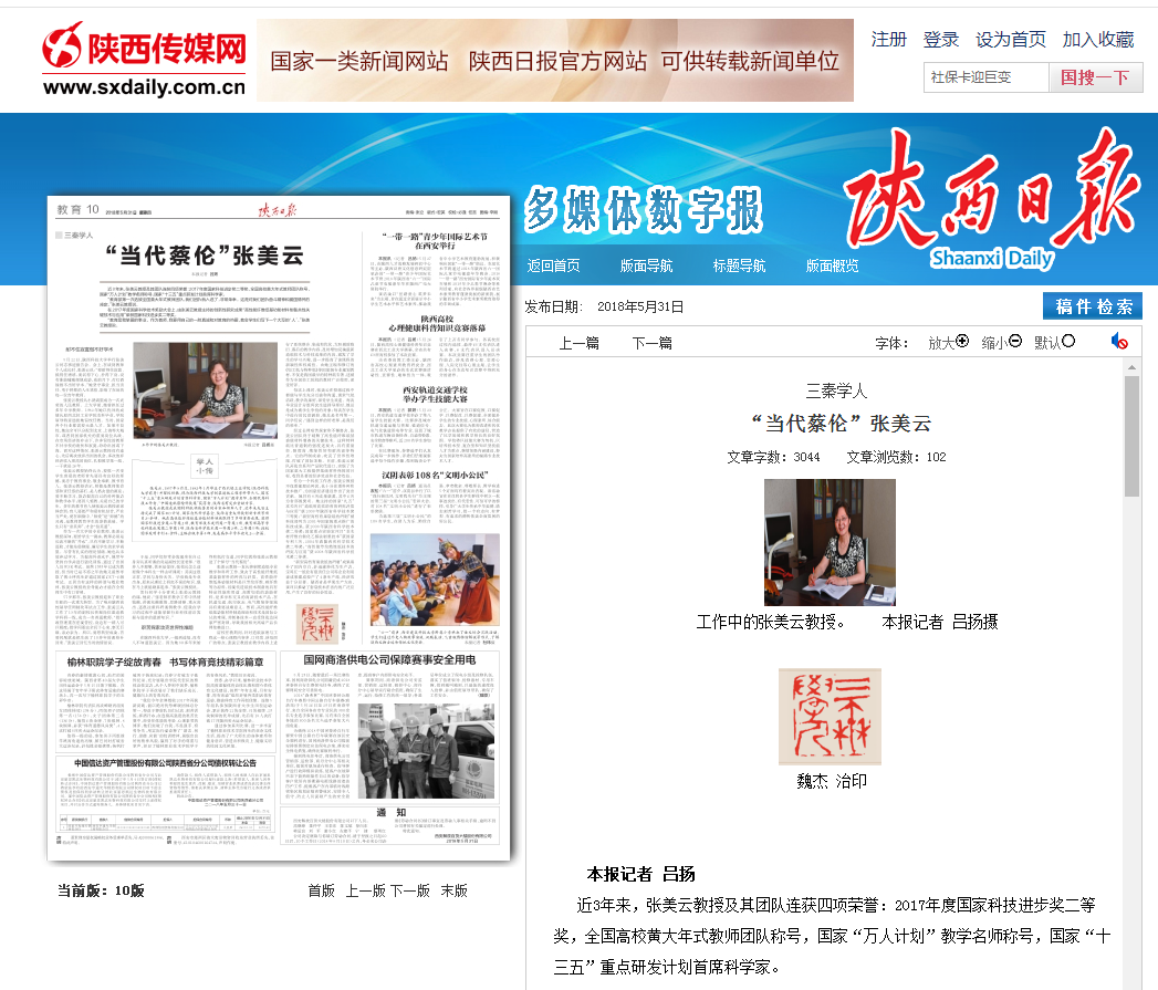 5月31日,《陜西日報》教育版以《三秦學(xué)人 “當代蔡倫”張美云》為題報道了我校張美云教授的教學(xué)科研事跡,全文轉(zhuǎn)載如下: