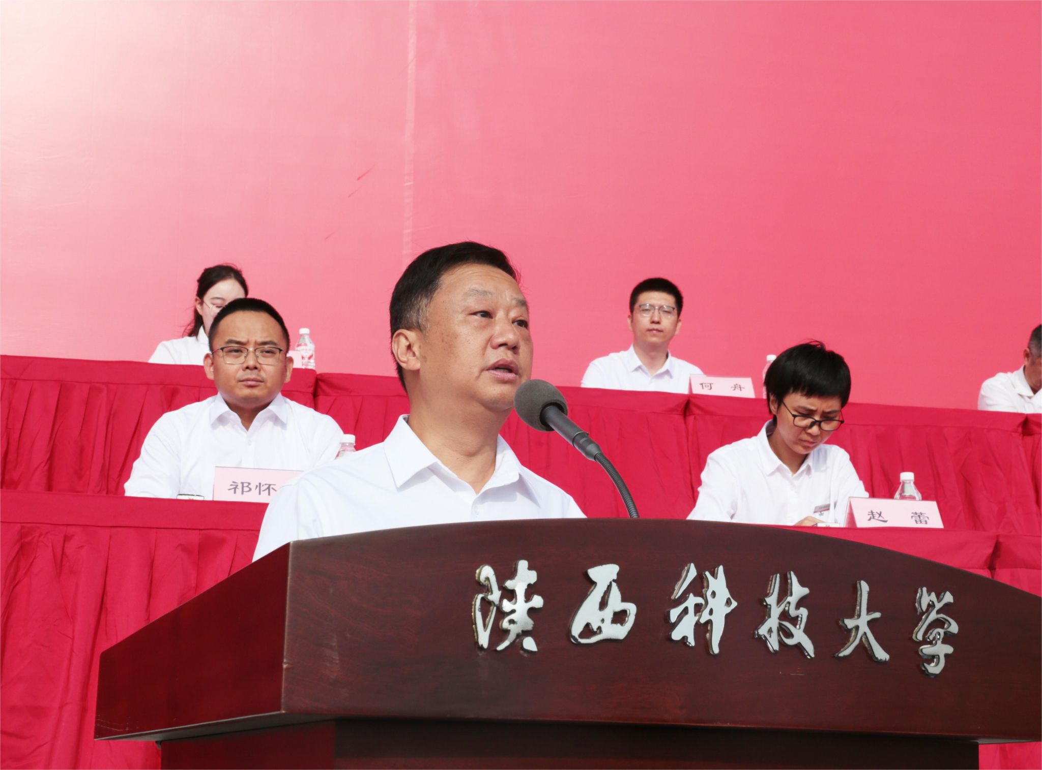 上午8點30分,開學(xué)典禮在莊嚴的國歌聲中拉開序幕。黃劍鋒代表學(xué)校向來自五湖四海的新同學(xué)們表示熱烈的歡迎和誠摯的問候。他回顧了建校67年來學(xué)?!叭齽?chuàng)兩遷”的辦學(xué)歷史和奮斗歷程,表示一代代陜科大人秉承“三創(chuàng)兩遷”大學(xué)精神和“至誠至博”校訓(xùn),推動學(xué)校在曲折奮進中破繭成蝶,培養(yǎng)出一大批政壇翹楚、學(xué)術(shù)大師和商界精英等國家社會棟梁之材。近年來,學(xué)校在學(xué)科建設(shè)、教學(xué)科研、科技成果轉(zhuǎn)化等方面取得一系列成就,持續(xù)構(gòu)建以學(xué)生成長成才為中心的高質(zhì)量人才培養(yǎng)體系,打造一流的基礎(chǔ)設(shè)施和現(xiàn)代化校園環(huán)境,辦學(xué)實力和影響力不斷增強,是一所歷史悠久、底蘊深厚,砥礪奮進、追求卓越,以人為本、宜居宜學(xué)的學(xué)府。