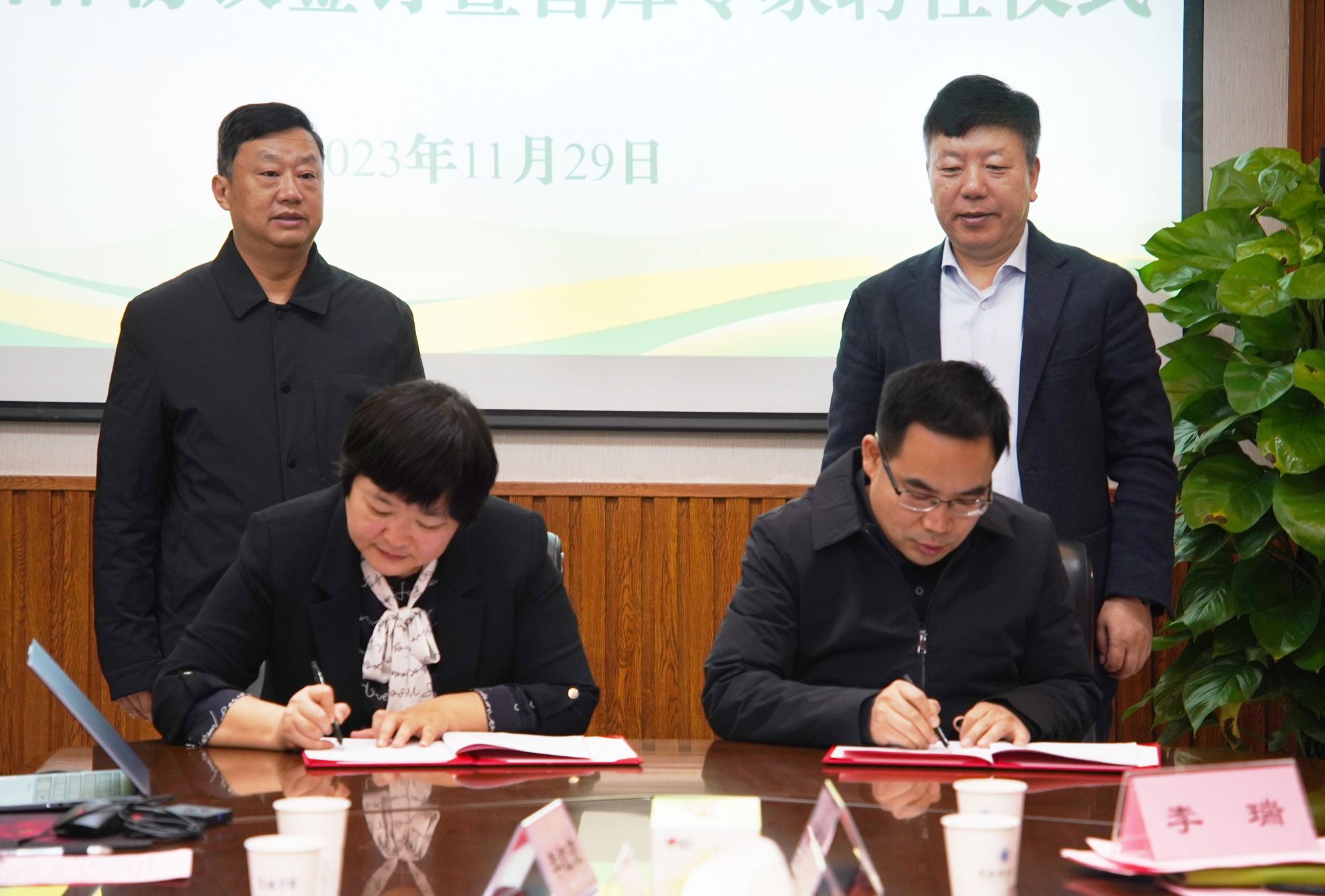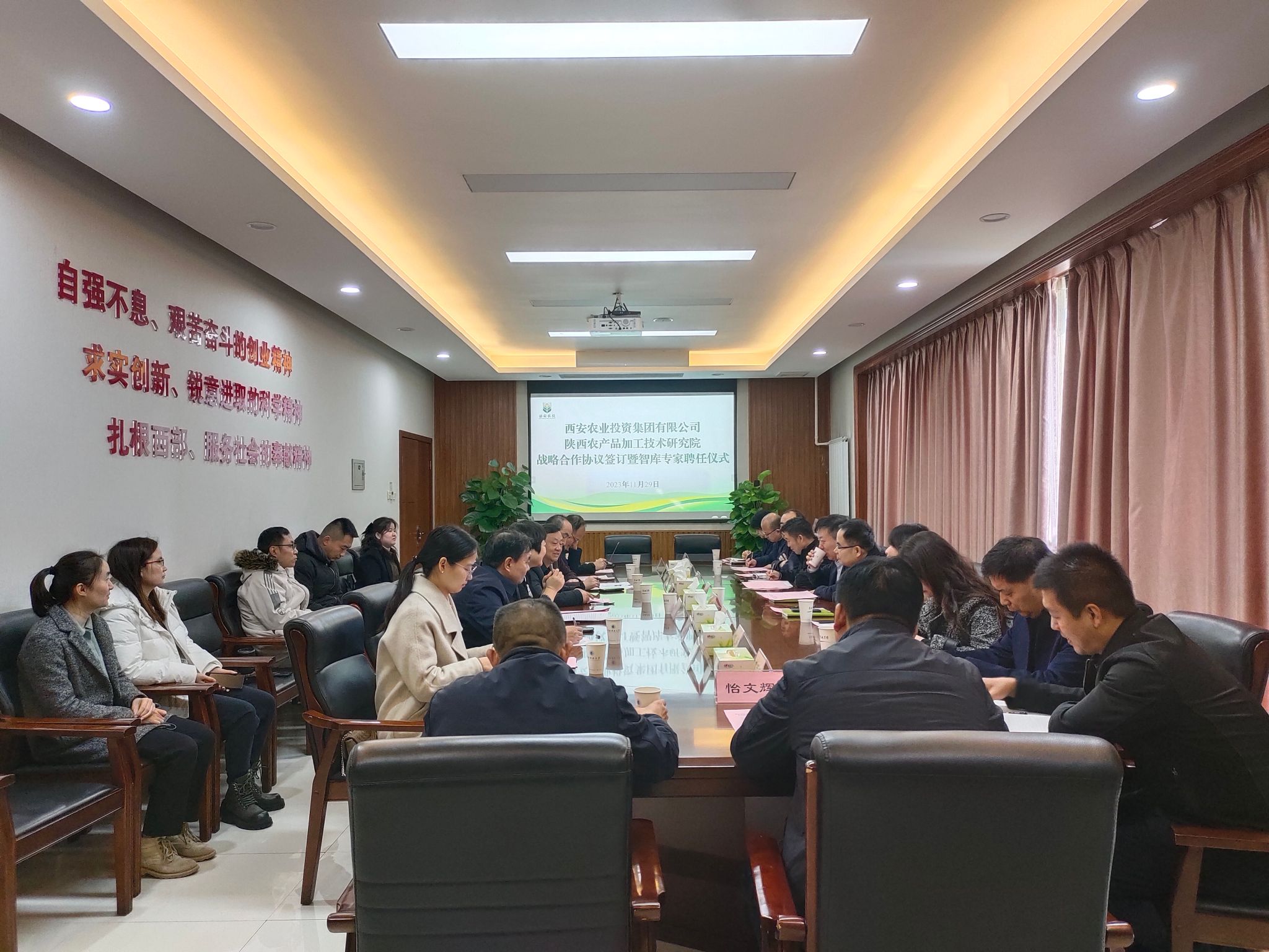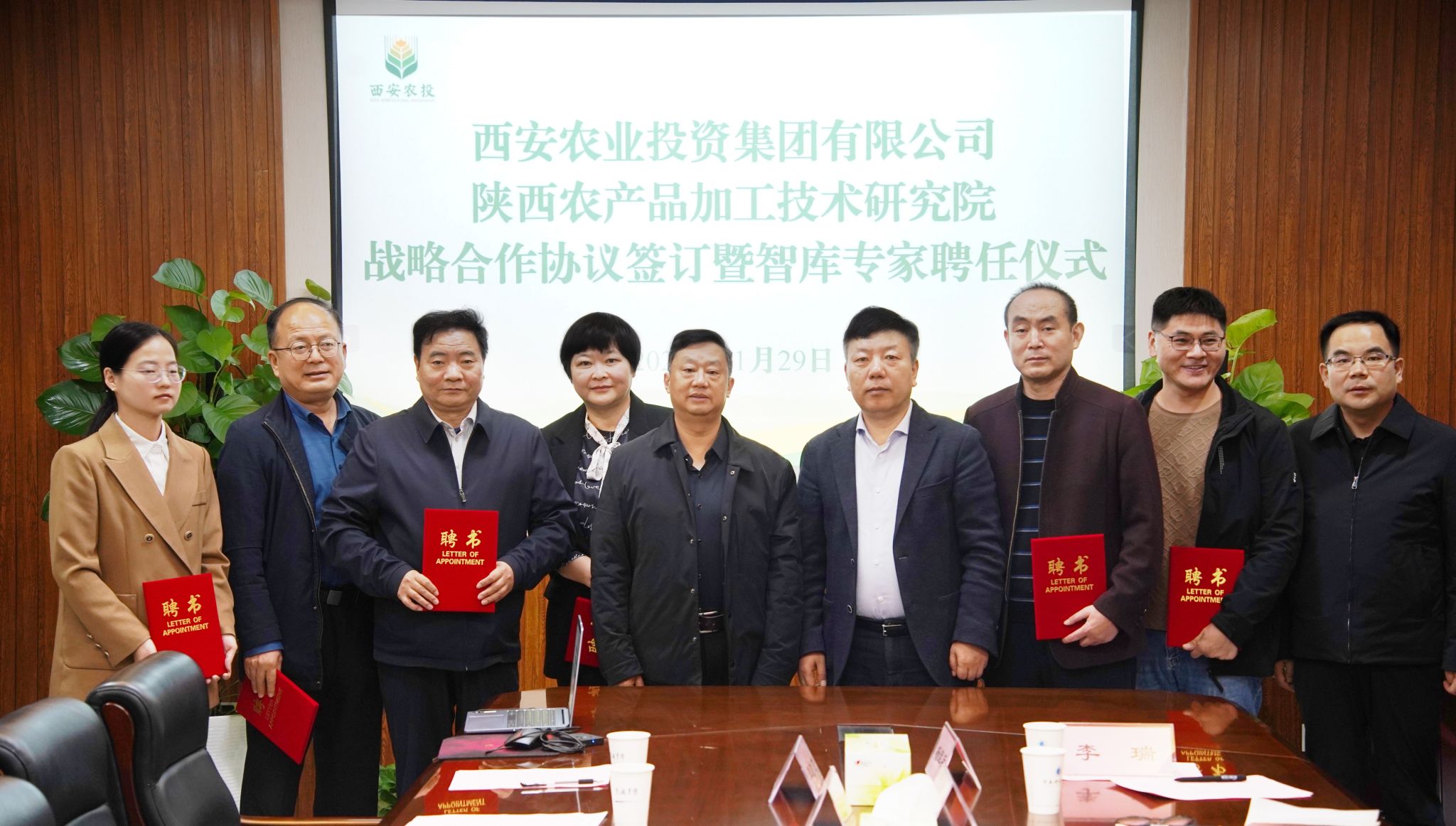 在雙方人員的共同見(jiàn)證下,莫海珍代表農(nóng)研院與西安農(nóng)業(yè)投資集團(tuán)有限公司簽署戰(zhàn)略合作協(xié)議,成斌為8位智庫(kù)專家頒發(fā)聘書(shū)。