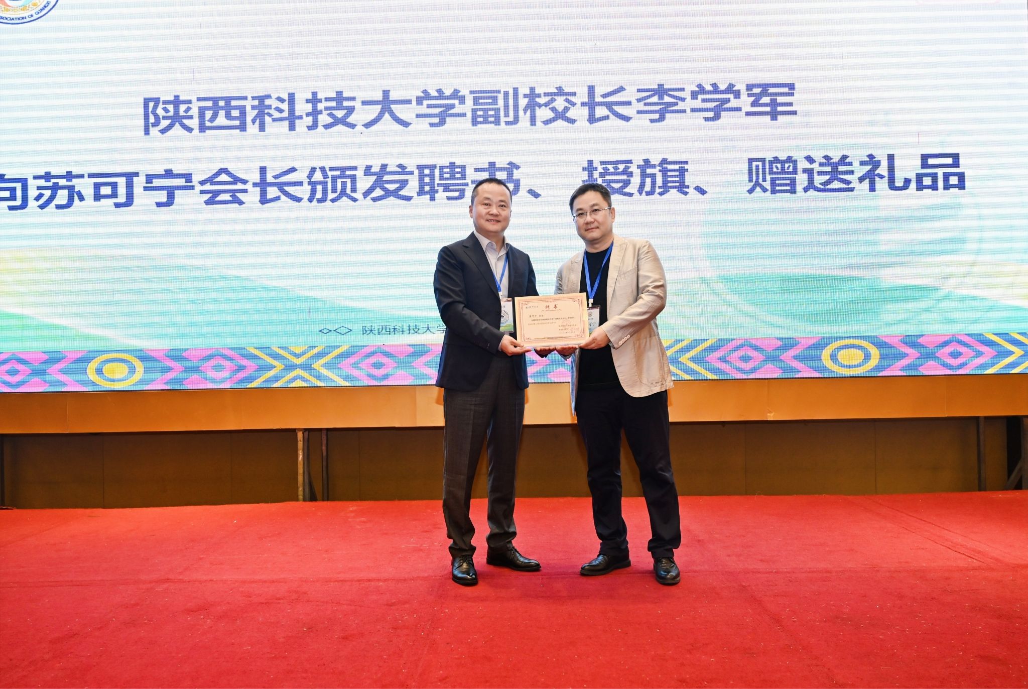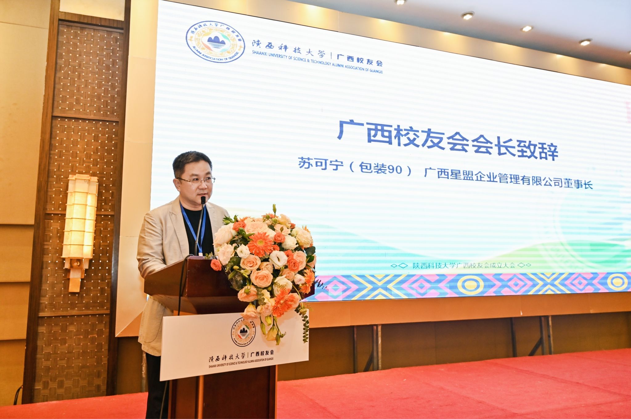 李學軍為廣西校友會會長、廣西星盟企業(yè)管理有限公司董事長蘇可寧(包裝90)頒發(fā)聘書,并向廣西校友會授旗。