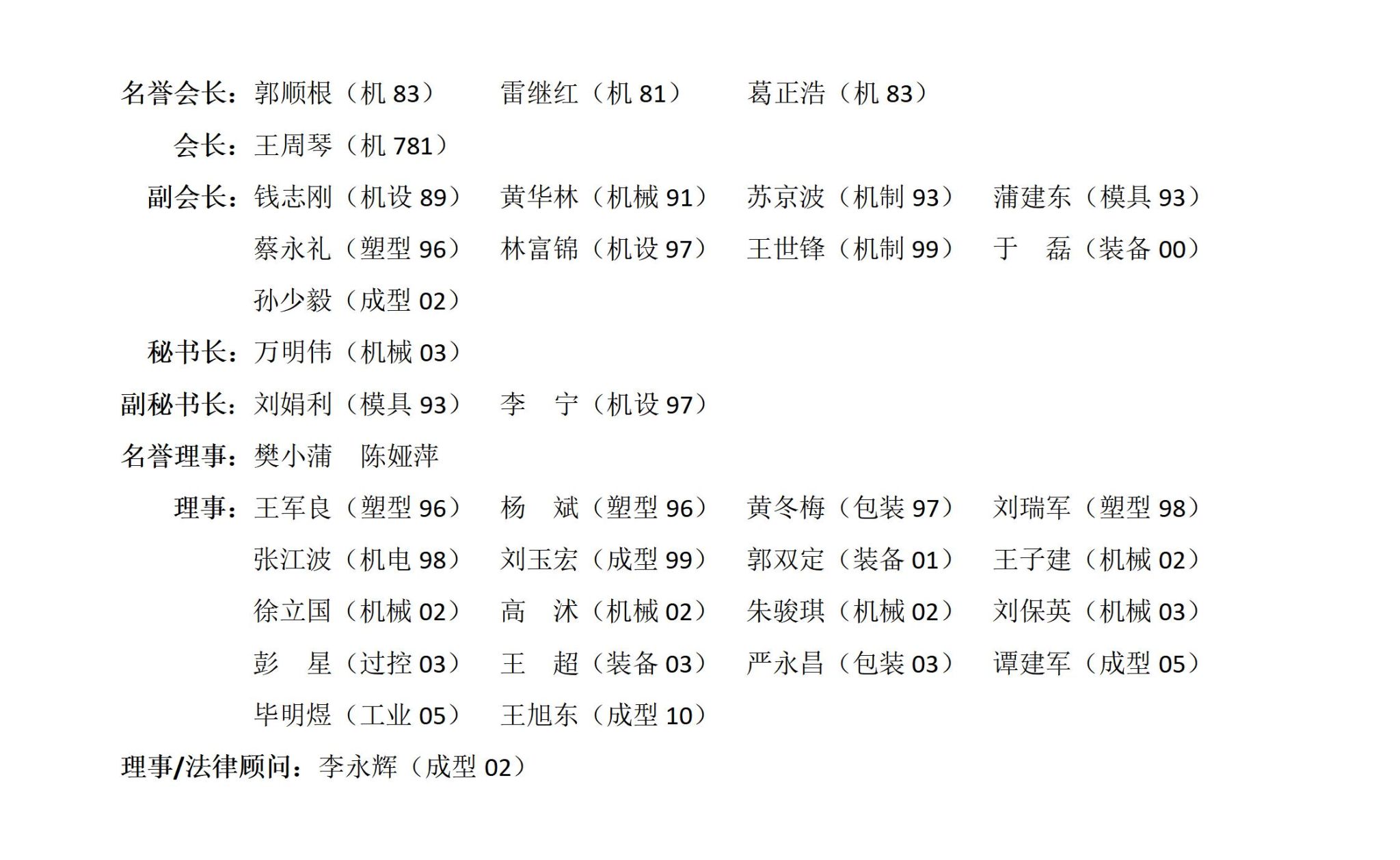 安徽校友會(huì)會(huì)長汪霖(材料86)、秘書長錢志剛(機(jī)設(shè)89),廈門校友會(huì)會(huì)長李玉柱(模具88)、理事張世標(biāo)(機(jī)設(shè)93),上海校友會(huì)執(zhí)行會(huì)長雷繼紅(機(jī)81)、常務(wù)副會(huì)長張標(biāo)(搪瓷89)、秘書長張陳斌(電子08),江西校友會(huì)副會(huì)長于磊(裝備00),溫州校友會(huì)秘書長徐浩(食品89),四川校友會(huì)秘書長陳鑫(工設(shè)96),浙江校友會(huì)副秘書長陳張國(皮革90),校友總會(huì)辦公室和機(jī)電學(xué)院相關(guān)老師參加了大會(huì)。