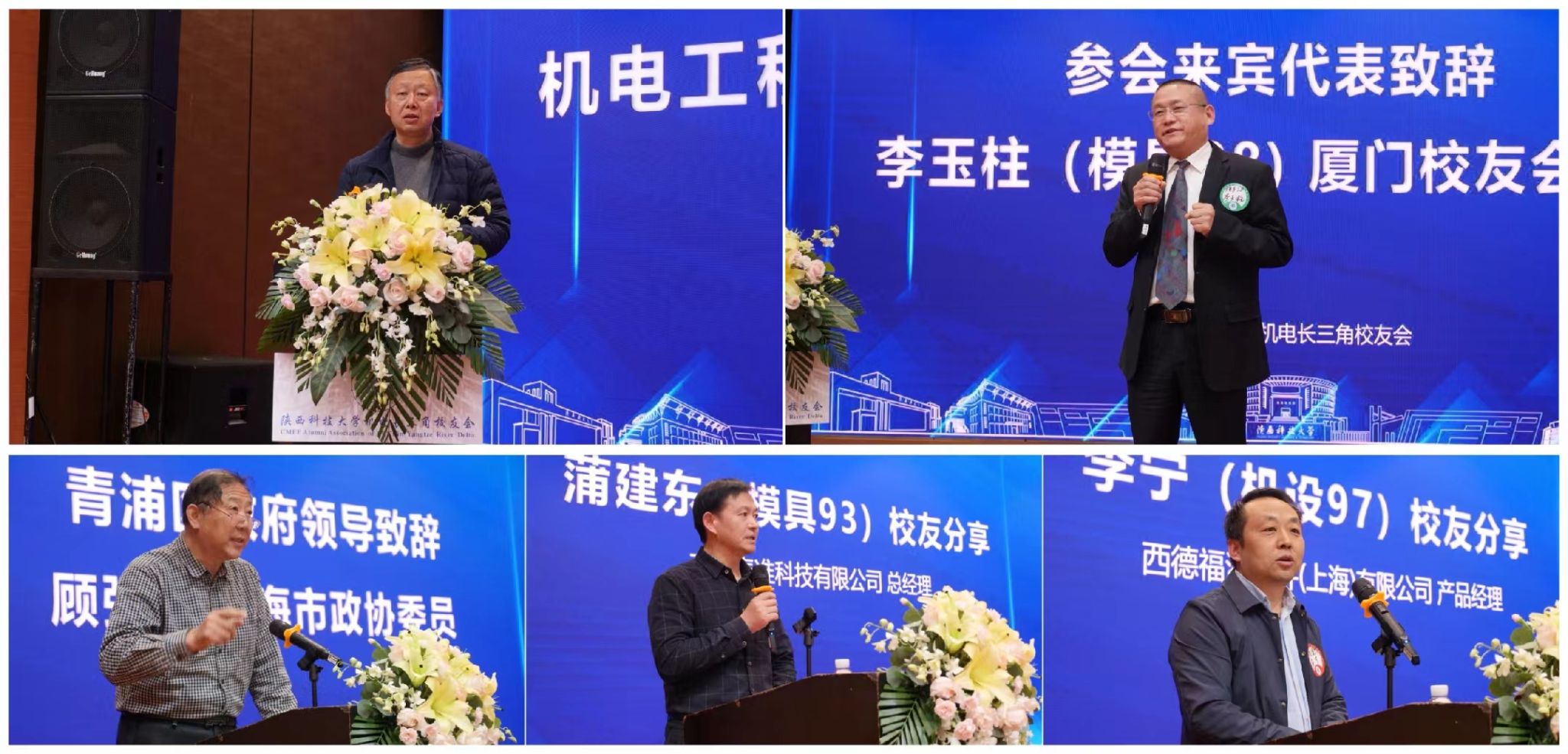 到會(huì)嘉賓代表廈門校友會(huì)會(huì)長李玉柱(模具88,右上)、上海市政協(xié)委員顧強(qiáng)(左下)現(xiàn)場致辭,校友蒲建東(模具93,下中)、李寧(機(jī)設(shè)97,右下)分享自己的創(chuàng)業(yè)故事。