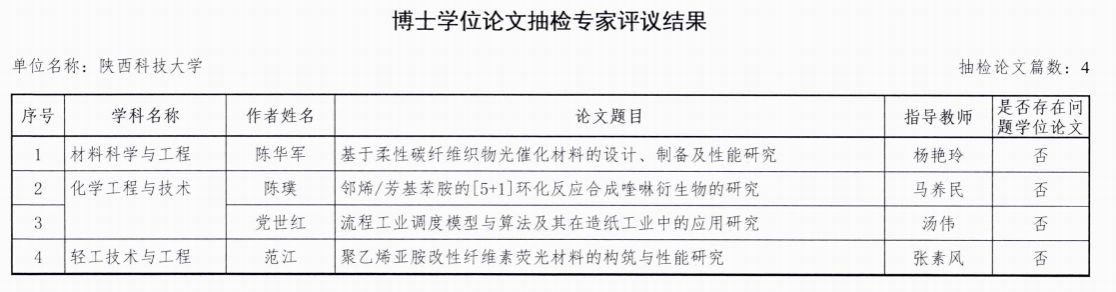 本次博士學(xué)位論文抽檢,是對2020-2021學(xué)年度全國授予博士學(xué)位的學(xué)位論文進(jìn)行的一次隨機(jī)抽檢。我校被抽檢的4篇博士學(xué)位論文涉及材料科學(xué)與工程、化學(xué)工程與技術(shù)、輕工技術(shù)與工程3個(gè)博士授權(quán)一級(jí)學(xué)科,專家評議結(jié)果全部合格。