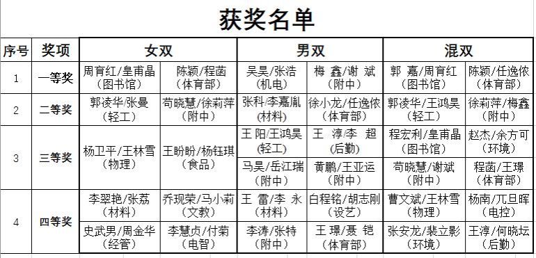 本次比賽分為專業(yè)組和業(yè)余組,其中專業(yè)組選手分別是來自體育部分會、附屬中學分會的體育老師,體育老師首次同臺競技。運動員們揮灑汗水,用行動倡導健康生活,用比賽詮釋友誼第一。選手們默契配合、靈活跑位、瀟灑的扣殺贏得在場觀眾陣陣喝彩聲。經過142場激烈角逐,最終決出女子雙打、男子雙打、混合雙打的前八名。