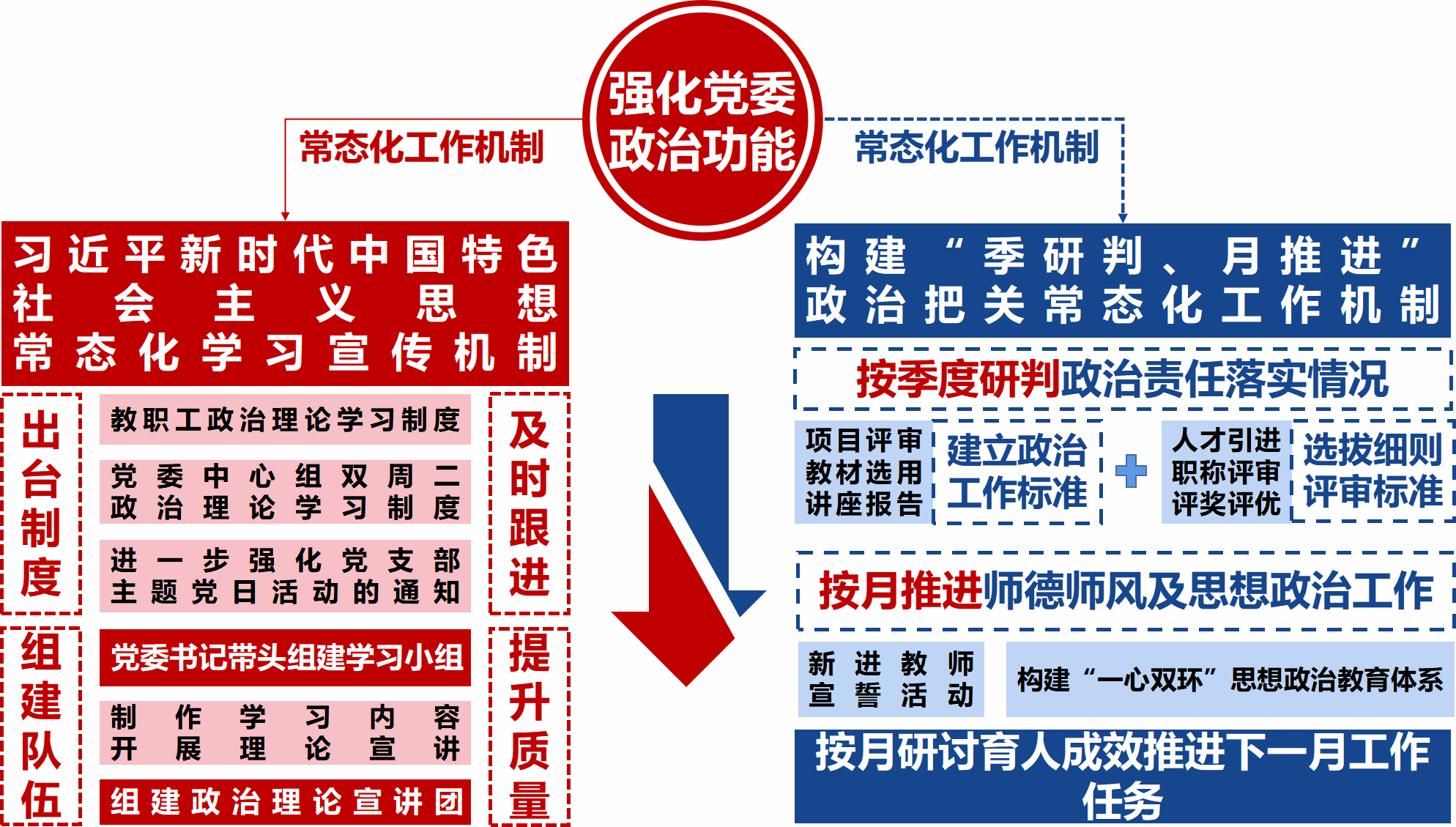 著力強(qiáng)化黨委政治功能。為強(qiáng)化黨委政治功能、加強(qiáng)黨委政治把關(guān)作用發(fā)揮,學(xué)院黨委建立了兩項(xiàng)常態(tài)化工作機(jī)制。構(gòu)建習(xí)近平新時(shí)代中國(guó)特色社會(huì)主義思想常態(tài)化學(xué)習(xí)宣傳機(jī)制。制定出臺(tái)《食品科學(xué)與工程學(xué)院教職工政治理論學(xué)習(xí)制度(修訂)》《食品科學(xué)與工程學(xué)院黨委中心組雙周二政治理論學(xué)習(xí)實(shí)施意見(修訂)》《食品與生物工程院黨委關(guān)于進(jìn)一步強(qiáng)化黨支部主題黨日活動(dòng)的通知》系列規(guī)章制度,成立理論學(xué)習(xí)小組,常態(tài)化及時(shí)梳理習(xí)近平總書記重要講話重要指示精神,注重結(jié)合黨的二十大精神、習(xí)近平總書記來(lái)陜考察重要講話重要指示精神、關(guān)于教育的重要論述等,通過(guò)固定學(xué)習(xí)時(shí)間、規(guī)定學(xué)習(xí)內(nèi)容、規(guī)范學(xué)習(xí)形式,及時(shí)跟進(jìn)學(xué)。學(xué)院黨委書記帶頭學(xué)習(xí),并結(jié)合實(shí)際定期講專題黨課、做宣講報(bào)告,傳達(dá)最新精神,分享學(xué)習(xí)體會(huì),例如,在學(xué)習(xí)貫徹習(xí)近平新時(shí)代中國(guó)特色社會(huì)主義思想主題教育中,學(xué)院黨委書記圍繞習(xí)近平新時(shí)代中國(guó)特色社會(huì)主義思想,先后四次在理論學(xué)習(xí)中心組學(xué)習(xí)會(huì)、教職工大會(huì)、所在黨支部、學(xué)院入黨積極分子培訓(xùn)會(huì)上講專題黨課、開展理論宣講;組建政治理論宣講團(tuán),學(xué)院4名黨員同志選拔進(jìn)入學(xué)校入黨積極分子黨課師資庫(kù),常態(tài)化學(xué)習(xí)宣傳成效明顯。構(gòu)建了“季研判、月推進(jìn)”的政治把關(guān)常態(tài)化工作機(jī)制。每季度分析研判政治責(zé)任落實(shí)情況,站在講政治的高度堅(jiān)決貫徹執(zhí)行黨的路線方針政策及學(xué)校各項(xiàng)決定。對(duì)項(xiàng)目評(píng)審、教材選用、講座報(bào)告等建立政治工作標(biāo)準(zhǔn),充分發(fā)揮監(jiān)督作用;對(duì)人才引進(jìn)、教職工職稱評(píng)審、評(píng)獎(jiǎng)評(píng)優(yōu)等工作堅(jiān)持德才兼?zhèn)?、以德為先,分別建立相應(yīng)的選拔細(xì)則、評(píng)審標(biāo)準(zhǔn)。按月研究推進(jìn)師德師風(fēng)及思想政治工作情況。按月在學(xué)院大會(huì)上開展新進(jìn)教師宣誓活動(dòng),堅(jiān)定育人初心;構(gòu)建以黨委為核心,系、黨支部與團(tuán)委、團(tuán)支部為雙環(huán)的“一心雙環(huán)”思想政治教育體系,按月研討育人成效、推進(jìn)下一月工作任務(wù)。