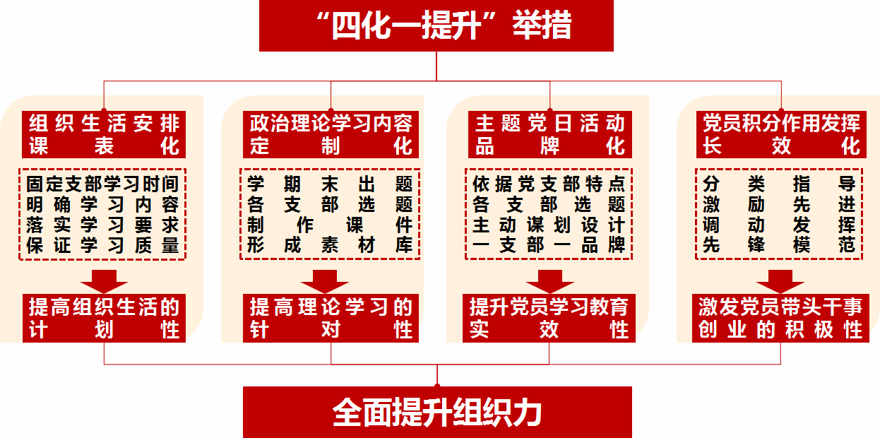 著力破解“中梗阻”現(xiàn)象。針對(duì)有的黨支部組織生活不經(jīng)常、不規(guī)范、質(zhì)量不高,黨員作用發(fā)揮效果不顯著等現(xiàn)象,學(xué)院黨委創(chuàng)造性的提出了“四化一提升”舉措,有力推動(dòng)黨支部高質(zhì)量建設(shè)。組織生活安排課表化。制定出臺(tái)《食品與生物工程學(xué)院黨支部組織生活安排課表化實(shí)施方案》,像安排課表一樣安排組織生活,每學(xué)期初,學(xué)院黨委下發(fā)融合黨委安排和支部自選而制定的支部組織生活安排“課表”,固定支部學(xué)習(xí)時(shí)間、明確學(xué)習(xí)內(nèi)容、落實(shí)學(xué)習(xí)要求,保證各支部組織生活質(zhì)量。政治理論學(xué)習(xí)內(nèi)容定制化。制定出臺(tái)《食品與生物工程學(xué)院黨委政治理論學(xué)習(xí)內(nèi)容定制化實(shí)施意見》,在每學(xué)期末,學(xué)院黨委列出下學(xué)期定制學(xué)習(xí)內(nèi)容,各支委選擇一個(gè)專題提前準(zhǔn)備學(xué)習(xí)內(nèi)容,制作學(xué)習(xí)課件,經(jīng)學(xué)院黨委審核把關(guān),建立理論學(xué)習(xí)素材庫(kù)。主題黨日活動(dòng)品牌化。制定出臺(tái)《食品與生物工程學(xué)院黨委關(guān)于進(jìn)一步強(qiáng)化黨支部主題黨日活動(dòng)的通知》依據(jù)黨支部特點(diǎn),調(diào)動(dòng)支委會(huì)主動(dòng)謀劃設(shè)計(jì),增強(qiáng)吸引力,打造一支部一品牌主題黨日活動(dòng)。黨員積分作用發(fā)揮長(zhǎng)效化。創(chuàng)新推進(jìn)實(shí)施《食品與生物工程學(xué)院黨委教職工黨員積分制實(shí)施辦法》《食品與生物工程學(xué)院學(xué)生黨員積分制管理實(shí)施辦法》,突出分類指導(dǎo)、激勵(lì)先進(jìn)的原則,充分調(diào)動(dòng)并發(fā)揮黨員在學(xué)院改革發(fā)展穩(wěn)定中的先鋒模范作用。黨員積分制實(shí)施以來(lái),學(xué)院教職工累計(jì)參與積分達(dá)4714人次,平均1043人次/年,在博士點(diǎn)申報(bào)、專業(yè)認(rèn)證等中心工作上充分發(fā)揮了先鋒模范作用。全面提升黨支部組織力?!八幕惶嵘迸e措實(shí)施以來(lái),各黨支部顯著提高了組織生活的計(jì)劃性、提高了政治理論學(xué)習(xí)的針對(duì)性、激發(fā)了支委會(huì)班子工作的創(chuàng)造性、激發(fā)了黨員帶頭干事創(chuàng)業(yè)的積極性。創(chuàng)新性的提出了一套可復(fù)制、可推廣的基層黨組織建設(shè)模式。