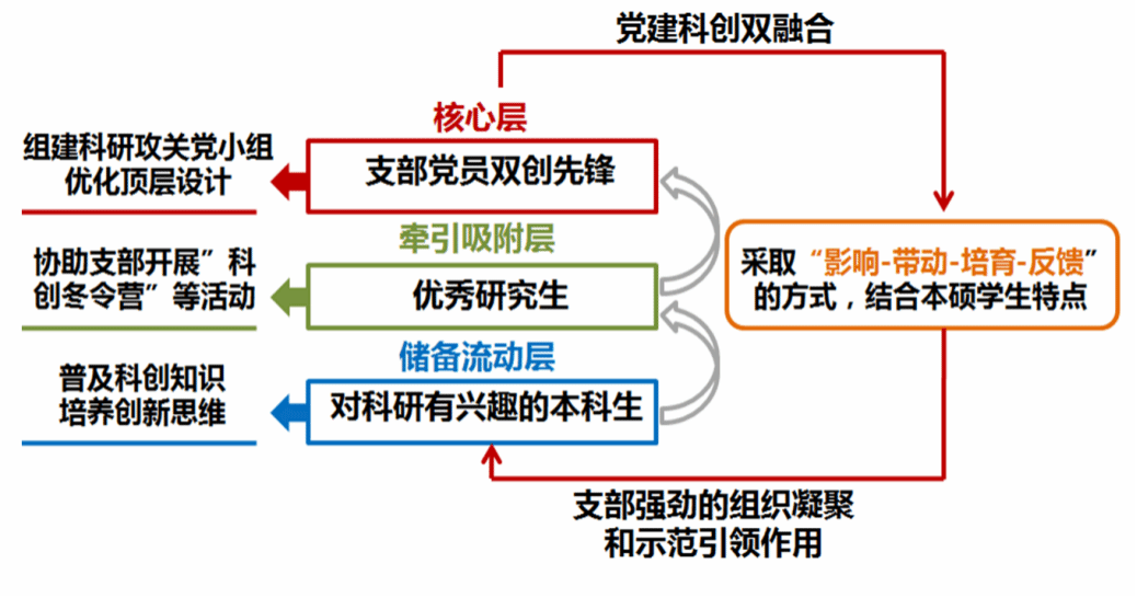 立育人之本,創(chuàng)新“雙電層”組織凝聚體系。從材料專業(yè)出發(fā),創(chuàng)造性引入學生創(chuàng)新實踐“雙電層”組織凝聚體系的概念,將支部作為正離子,學生作為負離子,形成以支部雙創(chuàng)先鋒為核心吸引,研究生為吸附層牽引,本科生為流動層儲備的雙電層組織凝聚體系。通過“科創(chuàng)冬令營”等品牌活動,既實現碩一本分類指導,又形成吸附層和流動層向核心梯度遞進的運行模式。