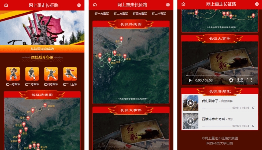 黨史學(xué)習(xí)教育是牢記初心使命、堅(jiān)定理想信念、推進(jìn)黨的自我革命的必然要求。陜西科技大學(xué)學(xué)子通過對長征歷史背景和整個(gè)歷程的梳理,整理了往年長征相關(guān)報(bào)道的研究分析,以長征動(dòng)態(tài)地圖的新技術(shù),創(chuàng)新推出《網(wǎng)上重走長征路互動(dòng)學(xué)習(xí)平臺(tái)》,讓廣大青年學(xué)生在網(wǎng)上身臨其境地重走長征路,重溫長征艱難,弘揚(yáng)長征精神。