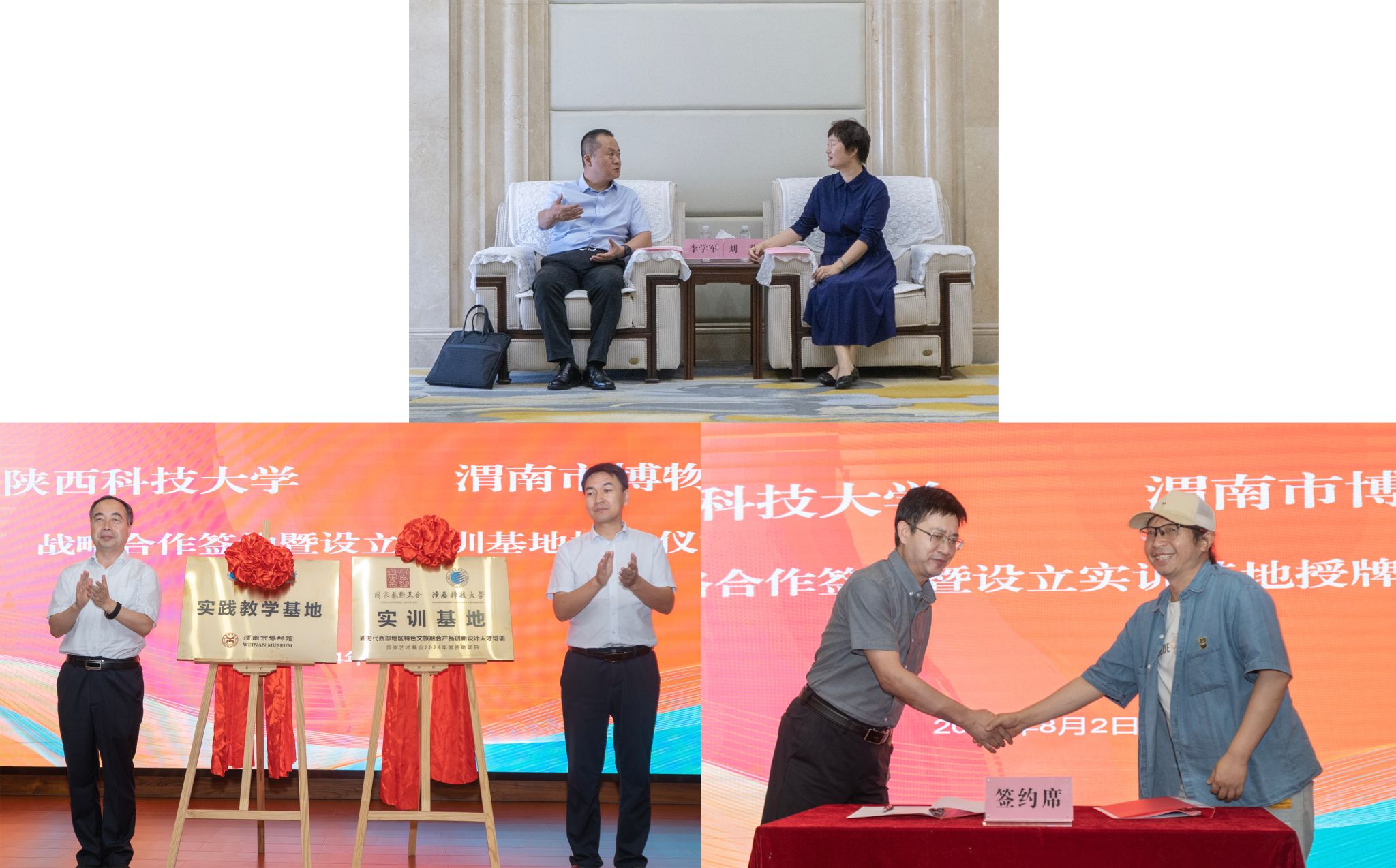 8月2日上午,依托國家藝術(shù)基金2024年度《新時代西部地區(qū)特色文旅融合產(chǎn)品創(chuàng)新設(shè)計(jì)人才培訓(xùn)》項(xiàng)目,我校與渭南市博物館簽訂共建實(shí)踐(教學(xué))基地協(xié)議及授牌儀式在渭南市博物館舉行。校黨委副書記李學(xué)軍、渭南市副市長劉莉出席相關(guān)活動。學(xué)科辦、教務(wù)處、科技處、設(shè)計(jì)與藝術(shù)學(xué)院,渭南市政府、市文化和旅游局、市委宣傳部、博物館等相關(guān)單位負(fù)責(zé)人出席活動。