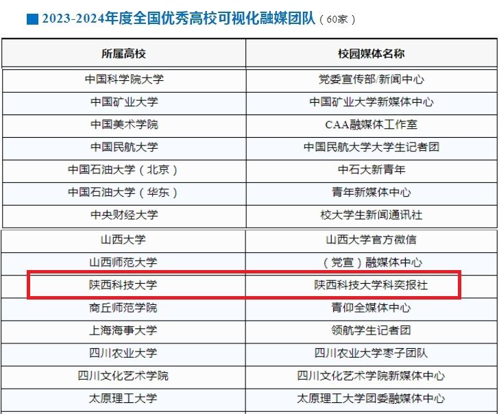 近日,由中國(guó)青年報(bào)社、中青校媒主辦的“2023-2024尋找高校可視化融媒團(tuán)隊(duì)”評(píng)選活動(dòng)結(jié)果揭曉,陜西科技大學(xué)科奕報(bào)社榮獲“2023-2024年度全國(guó)優(yōu)秀高校可視化融媒團(tuán)隊(duì)”稱號(hào)(全國(guó)60家)。