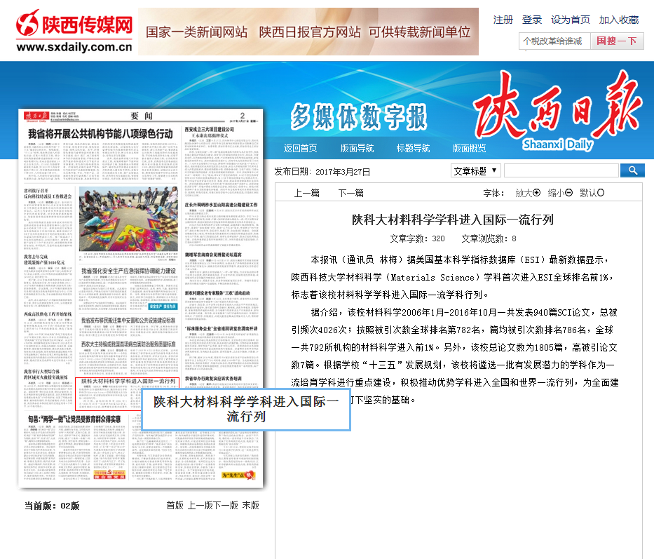 陜西日?qǐng)?bào)3月27日在“要聞”版以《陜科大材料科學(xué)學(xué)科進(jìn)入國(guó)際一流行列》為題,報(bào)道了我校材料科學(xué)學(xué)科首次進(jìn)入ESI全球排名前1%的新聞,全文轉(zhuǎn)載如下: