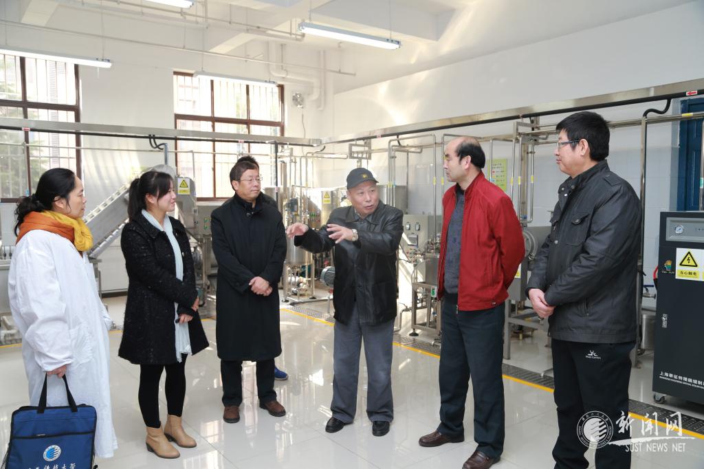 在食品學(xué)院果汁生產(chǎn)線上,潘中偉了解了相關(guān)生產(chǎn)工藝,詳細(xì)詢問了果汁生產(chǎn)的“清洗—提升—破碎—打漿去核—螺旋榨汁—噴霧啟動(dòng)”等生產(chǎn)過程以及學(xué)生工程實(shí)踐教學(xué)的效果,并就生產(chǎn)車間的設(shè)備安全、衛(wèi)生、室溫控制等方面進(jìn)行仔細(xì)檢查,對(duì)生產(chǎn)設(shè)備改造以及后續(xù)軟硬件設(shè)施建設(shè)等問題提出意見和建議。