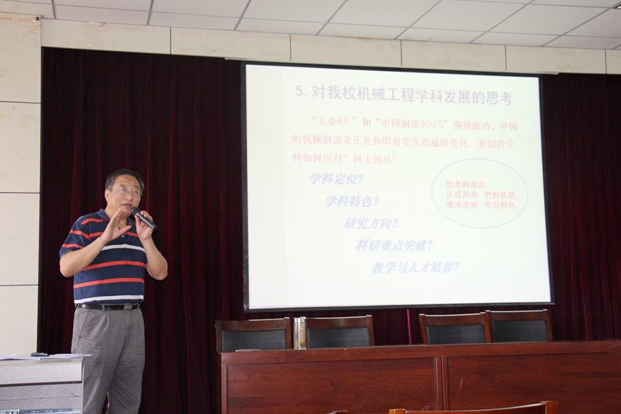 報(bào)告開始,曹巨江教授首先提出我國(guó)機(jī)械裝備制造業(yè)面臨的機(jī)遇與挑戰(zhàn)以及如何發(fā)展的問題,然后就“工業(yè)4.0”和“中國(guó)制造2025”的概念與戰(zhàn)略要點(diǎn)進(jìn)行了解讀。隨后,他結(jié)合學(xué)校和學(xué)院的實(shí)際情況,引導(dǎo)全院教師在認(rèn)清形勢(shì)、把握機(jī)遇、繼承發(fā)展、突出特色的基礎(chǔ)上對(duì)我校機(jī)械工程學(xué)科發(fā)展進(jìn)行思考。