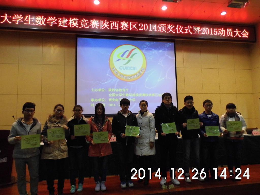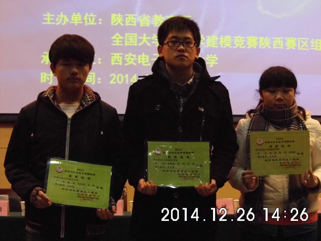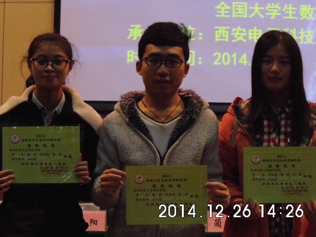 2014年學(xué)院首次組織學(xué)生參加全國大學(xué)生數(shù)學(xué)建模競賽和數(shù)學(xué)競賽,隊(duì)員主要從高數(shù)基地班中選拔,共12名學(xué)生組成4支隊(duì)伍參加建模競賽,239名同學(xué)參加數(shù)學(xué)競賽,并統(tǒng)籌聘請陜西科技大學(xué)的優(yōu)秀建模教練組和學(xué)院的優(yōu)秀青年教師對參賽學(xué)生進(jìn)行暑期集中培訓(xùn)、輔導(dǎo)及后期強(qiáng)化訓(xùn)練。歷經(jīng)1個(gè)多月緊張學(xué)習(xí),同學(xué)們同心協(xié)力、團(tuán)結(jié)拼搏、不畏困難,最終取得了優(yōu)異的成績,為學(xué)院贏得了榮譽(yù)。