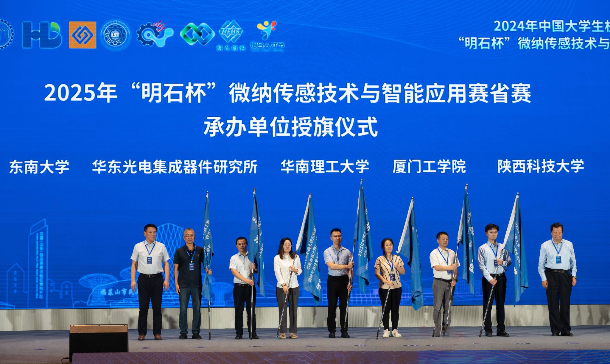 蔣莊德院士(右一)為我校(我校代表右三)頒發(fā)2025年“明石杯”省賽承辦單位旗