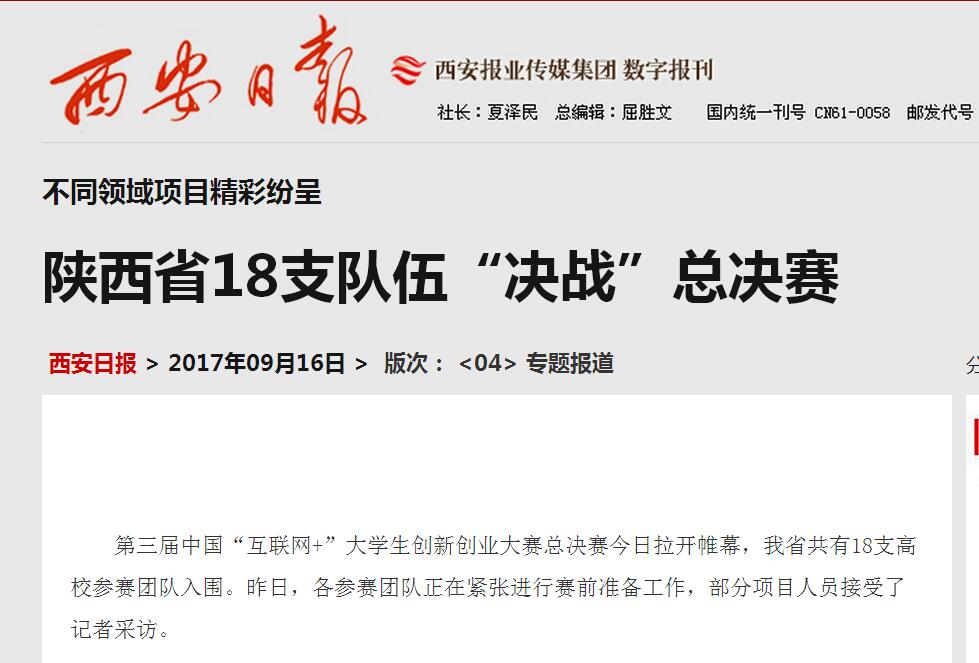 9月16至18日,第三屆中國“互聯(lián)網(wǎng)+”大學(xué)生創(chuàng)新創(chuàng)業(yè)大賽總決賽在西安電子科技大學(xué)舉行,我校2支隊(duì)伍入圍總決賽。陜西廣播電視臺《新聞聯(lián)播》、《西安日報》等媒體對我校參賽團(tuán)隊(duì)進(jìn)行了報道。