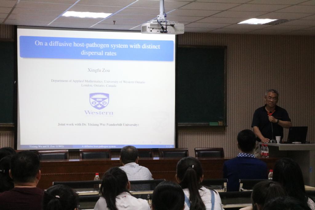 6月12號,來自加拿大西安大略大學(University of Western Ontario)的博士生導師鄒幸福教授應邀來校做了“具有不同分散速率和空間異質性的一類反應擴散宿主--病原體系統(tǒng)的研究”學術報告。報告由文理學院院長藺小林教授主持,參加學術報告的有文理學院數(shù)學系中青年教師、碩士研究生導師、研究生、以及本科生等。