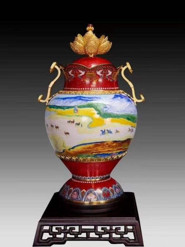 2024年3月21日,北京市琺瑯廠與中外琺瑯美術館舉行《一路錦繡》山海尊首發(fā)儀式?!兑宦峰\繡》山海尊由中國工藝美術大師鐘連盛、李文躍,聯(lián)手國畫家崔自默以及2016年杭州G20峰會的首飾設計師王春剛共同創(chuàng)作,獻禮新中國成立75周年。該作品展現(xiàn)了景泰藍、陶瓷、國畫、花絲鑲嵌、雕鏨等工藝融合的非凡魅力,寄托了對祖國深厚的情感與崇高敬意。