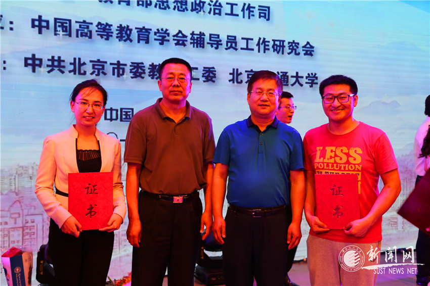 省委高教工委副書記李智軍(圖右二)、校黨委副書記溫鋒(圖左二)與獲獎輔導(dǎo)員王雪婧、張欽峰合影