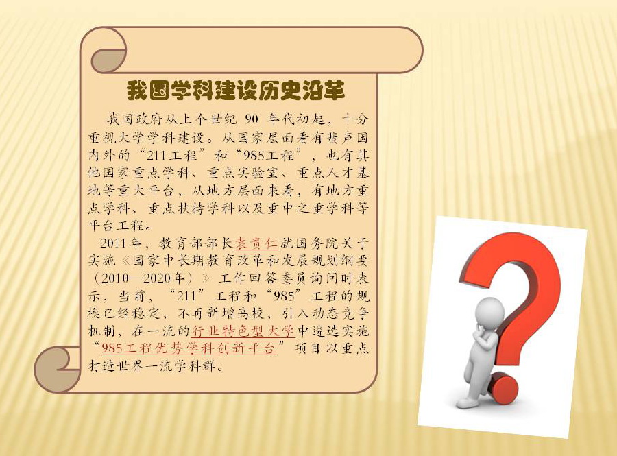 【導(dǎo)語】 學(xué)科建設(shè)是高校建設(shè)和發(fā)展的核心,體現(xiàn)著一所高校的水平、特色、建設(shè)層次。當(dāng)前,圍繞建設(shè)“一流大學(xué)、一流學(xué)科”的發(fā)展目標(biāo),全校上下正在為通過2016年全國一級學(xué)科評估工作做最后的沖刺。藉此,黨委宣傳部陸續(xù)推出學(xué)科建設(shè)【圖說】系列相關(guān)報道,澄清關(guān)于學(xué)科和學(xué)科建設(shè)的相關(guān)認(rèn)識,營造濃郁的學(xué)科及學(xué)科建設(shè)“人人關(guān)注、人人參與、人人上心”的校園輿論氛圍。(核稿:任工昌 方潤澤 策劃編輯:杜楊 學(xué)生編輯:康松磊)