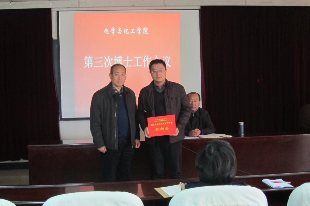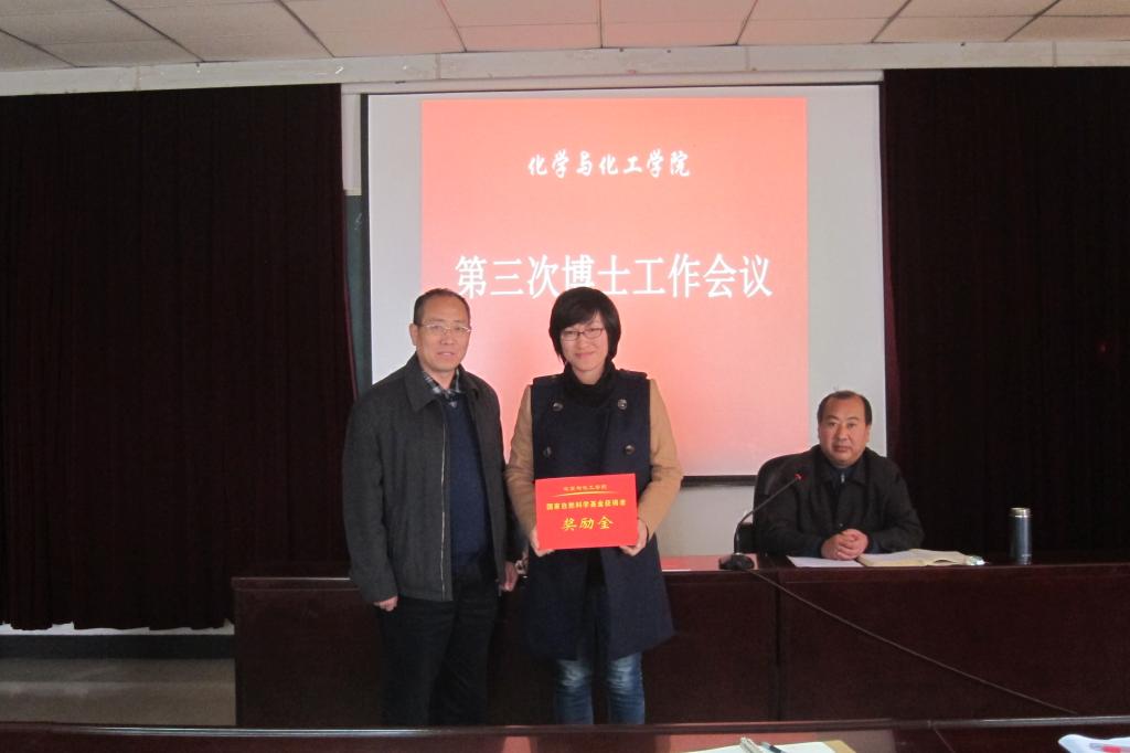 會上,化工學院對2015年國家自然科學基金獲得者楊冬、費貴強進行了表彰并頒發(fā)獎金,并號召全院科研人才以他們?yōu)榘駱?,努力提升科研能力,多申報科研立項,轉化科研成果,不遺余力做好化學工程與技術一級學科建設。