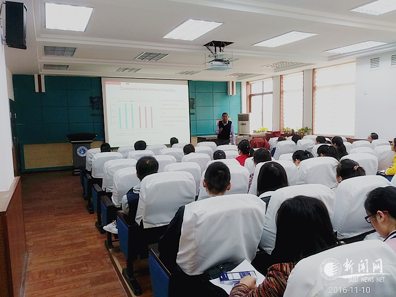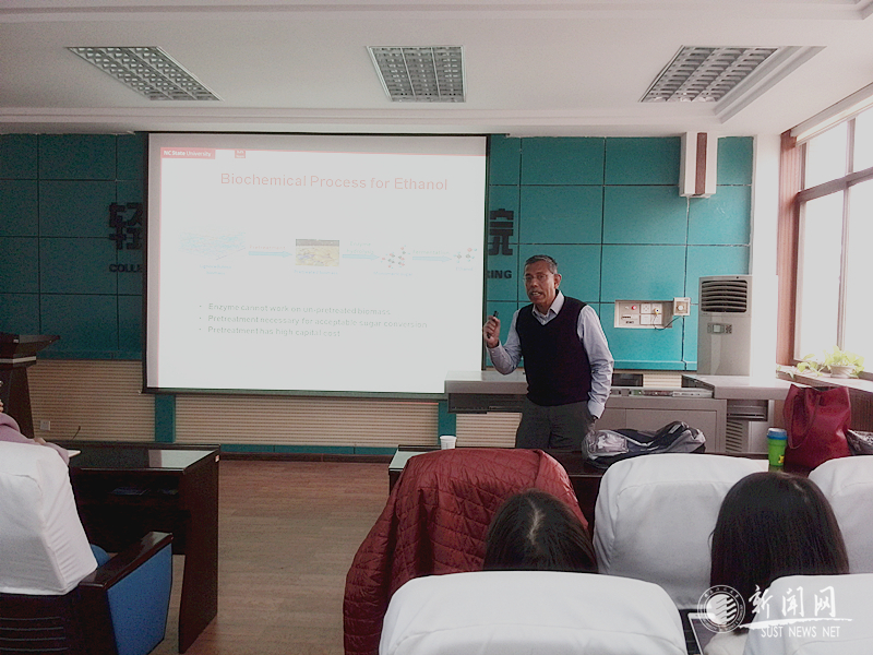 實(shí)驗(yàn)樓1B318他為在座學(xué)生作了題為“高溫預(yù)水解結(jié)合機(jī)械磨漿用于木質(zhì)纖維及木素生產(chǎn)高值化產(chǎn)品”的學(xué)術(shù)報(bào)告。本場(chǎng)報(bào)告會(huì)由輕工科學(xué)與工程學(xué)院副院長(zhǎng)張素風(fēng)教授主持,為我?!皩?dǎo)師論壇”系列學(xué)術(shù)報(bào)告。報(bào)告中,漢森·嘉米爾(Hasan Jameel)教授首先介紹了生物質(zhì)精煉的內(nèi)涵、發(fā)展及前景,主要從燃料乙醇與生物柴油轉(zhuǎn)化,琥珀酸、糠醛、羥甲基糠醛等高附加值化學(xué)品轉(zhuǎn)化,以及木素基膠黏劑與泡沫材料等方面進(jìn)行了詳細(xì)闡述。他重點(diǎn)講述了高溫預(yù)水解結(jié)合機(jī)械法磨漿預(yù)處理在生物質(zhì)精煉中的重要性與優(yōu)勢(shì),其優(yōu)勢(shì)在于綠色環(huán)保性、低成本、弱腐蝕性、與酸預(yù)處理相比具有較少的降解產(chǎn)物、無(wú)硫殘余物(木素),有利于高附加值產(chǎn)品轉(zhuǎn)化等。隨后他又闡述了由于成本較高導(dǎo)致木質(zhì)纖維素轉(zhuǎn)化乙醇此路線受制約的問(wèn)題,因此未來(lái)需要將預(yù)處理后所得木聚糖、纖維素、木素等進(jìn)行分離分級(jí),進(jìn)而轉(zhuǎn)化為不同化學(xué)品材料,如木材膠黏劑、泡沫材料等。