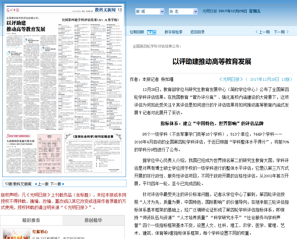 2017年12月28日,教育部學位與研究生教育發(fā)展中心公布了全國第四輪學科評估結果。29日,光明日報記者發(fā)表了《 全國第四輪學科評估結果公布:以評助建推動高等教育發(fā)展》的文章,全文轉載如下: