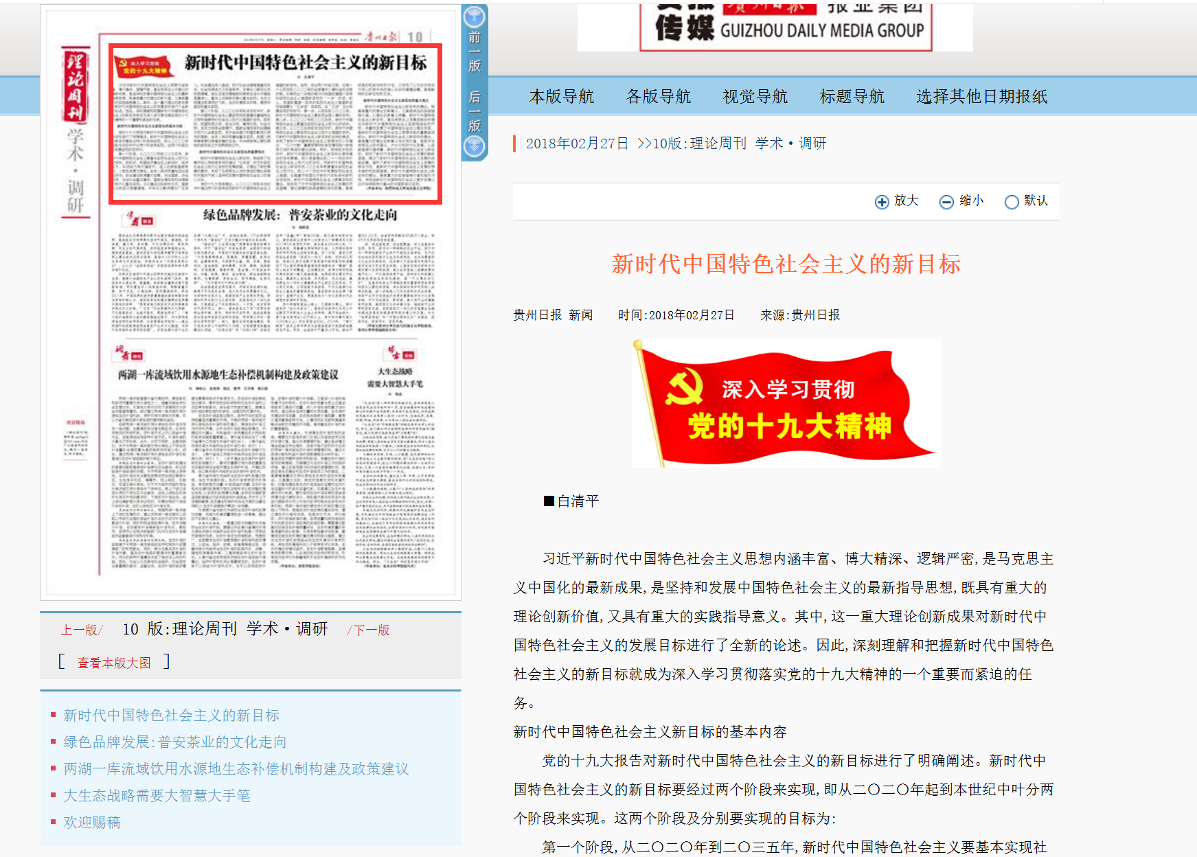 貴州日報2月27日“理論周刊”版刊發(fā)我校馬克思主義學(xué)院白清平副教授的署名文章《新時代中國特色社會主義的新目標(biāo)》,全文轉(zhuǎn)載如下: