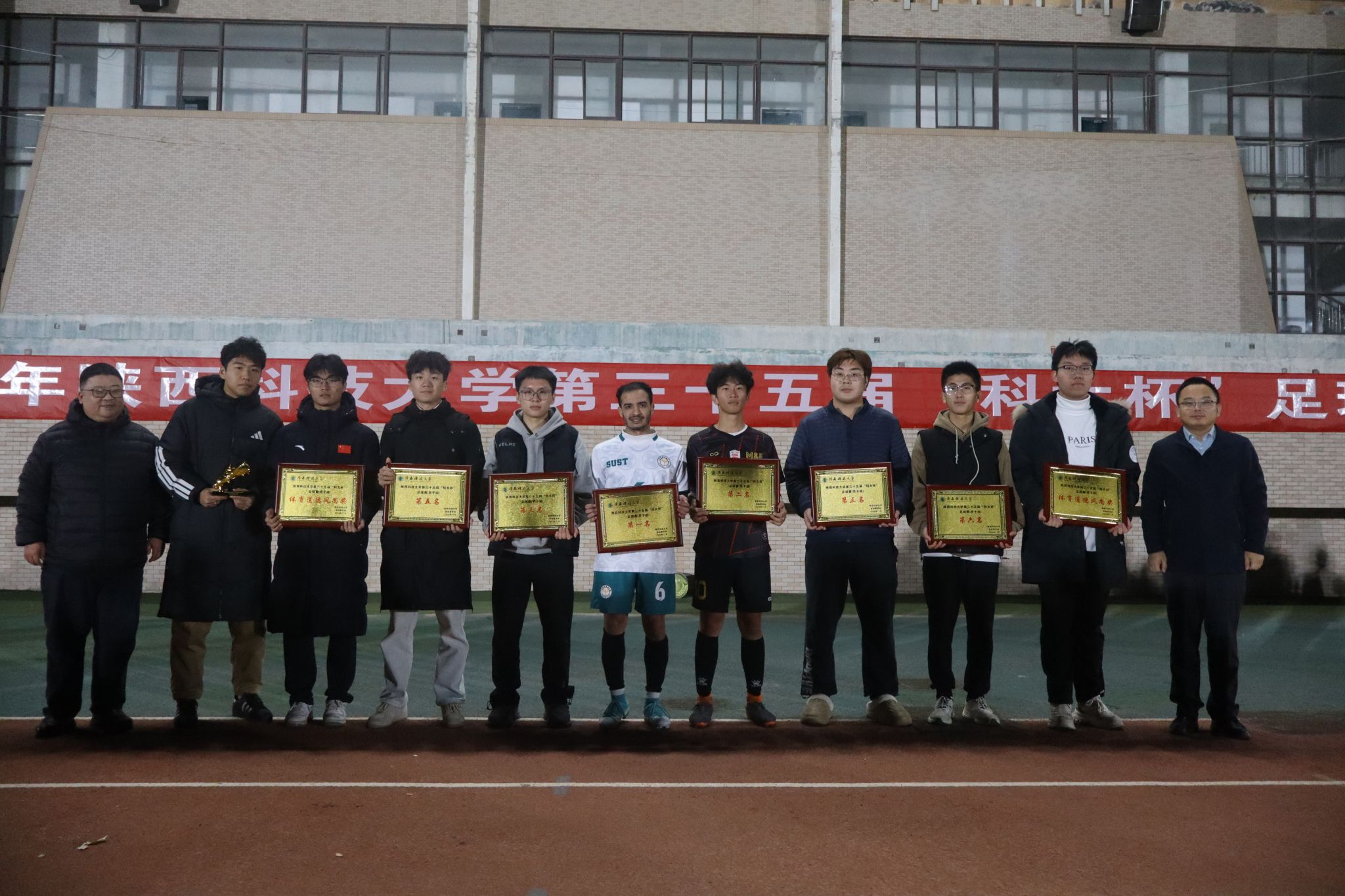 為確保賽事的順利進(jìn)行,體育教師帶領(lǐng)學(xué)生體育競(jìng)賽管理中心的學(xué)生裁判共同執(zhí)裁,保證此次比賽的公平公正。經(jīng)過(guò)激烈的角逐,國(guó)際教育學(xué)院摘得桂冠,機(jī)電工程學(xué)院(智能制造與機(jī)器人工程學(xué)院)榮獲亞軍,材料科學(xué)與工程學(xué)院(文物保護(hù)科學(xué)與技術(shù)學(xué)院)和經(jīng)濟(jì)與管理學(xué)院(亞歐貿(mào)易與數(shù)字經(jīng)濟(jì)學(xué)院)并列獲得第三名,輕工科學(xué)與工程學(xué)院(柔性電子學(xué)院)、電子信息與人工智能學(xué)院分獲五、六名,體育道德風(fēng)尚獎(jiǎng)分別由食品科學(xué)與工程學(xué)院(生物與醫(yī)藥學(xué)院)和數(shù)學(xué)與數(shù)據(jù)科學(xué)學(xué)院獲得。閉幕式上,校團(tuán)委書(shū)記李鵬和體育部直屬黨支部書(shū)記祁懷遠(yuǎn)為獲獎(jiǎng)隊(duì)伍頒發(fā)獎(jiǎng)牌,本次比賽裁判長(zhǎng)徐小龍為材料科學(xué)與工程學(xué)院趙海州頒發(fā)代表最佳射手的金靴獎(jiǎng)杯。