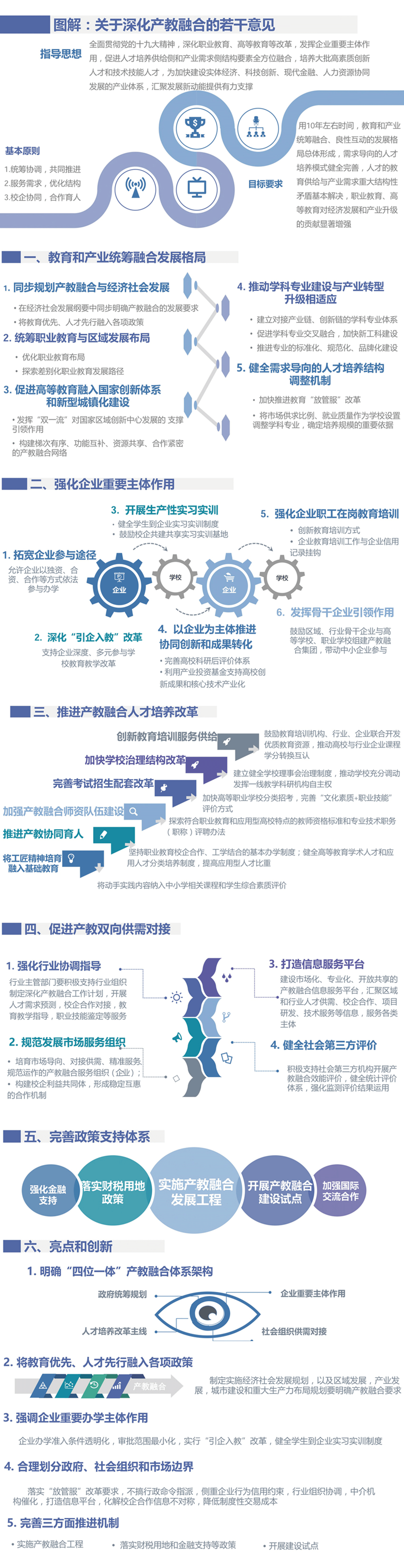 《意見》堅持問題導向,重點聚焦與就業(yè)市場、企業(yè)需求、創(chuàng)新創(chuàng)業(yè)直接相連的職業(yè)教育、高等教育,重點聚焦調動企業(yè)參與積極性,發(fā)揮企業(yè)重要主體作用,形成政府企業(yè)學校行業(yè)社會協(xié)同參與的工作格局,著力構建產(chǎn)教融合一攬子政策體系。宏觀上,發(fā)揮好政府統(tǒng)籌作用,同步規(guī)劃產(chǎn)教融合和經(jīng)濟社會發(fā)展,優(yōu)化職業(yè)教育、高等教育布局結構,促進教育和產(chǎn)業(yè)聯(lián)動發(fā)展。微觀上,促進人才供需兩端相向發(fā)力,引導產(chǎn)業(yè)需求融入人才供給,促進產(chǎn)教融合供需對接,支持校企協(xié)同開展人才培養(yǎng)和科技創(chuàng)新。政策上,著力完善體系,綜合運用投資、財稅、用地、金融和試點,形成激勵保障協(xié)同支持,強化組織實施。