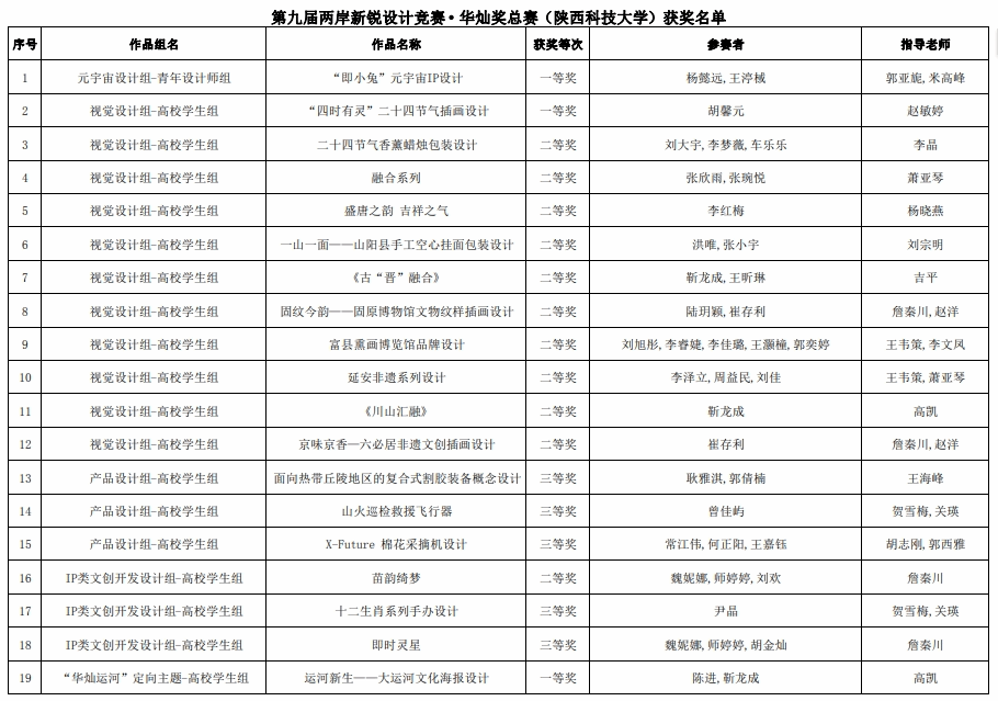 12月4日,華燦獎組委員公布了第九屆兩岸新銳設(shè)計競賽·華燦獎全國賽的最終獲獎名單。第九屆兩岸新銳設(shè)計競賽·華燦獎由中國高等教育學(xué)會、中華中山文化交流協(xié)會、北京歌華傳媒集團有限責(zé)任公司主辦,自2024年4月啟動以來經(jīng)過5個月的作品征集,共收到7萬余件參賽作品。經(jīng)校賽、賽區(qū)賽評審、總賽網(wǎng)絡(luò)評審、現(xiàn)場評審及公示,本屆華燦獎34個賽區(qū)共評選出全國賽獲獎作品2749項,陜西科技大學(xué)在本次競賽中獲獎19項(其中一等獎3項,二等獎11項,三等獎5項),取得了自參加華燦獎以來的最好成績。