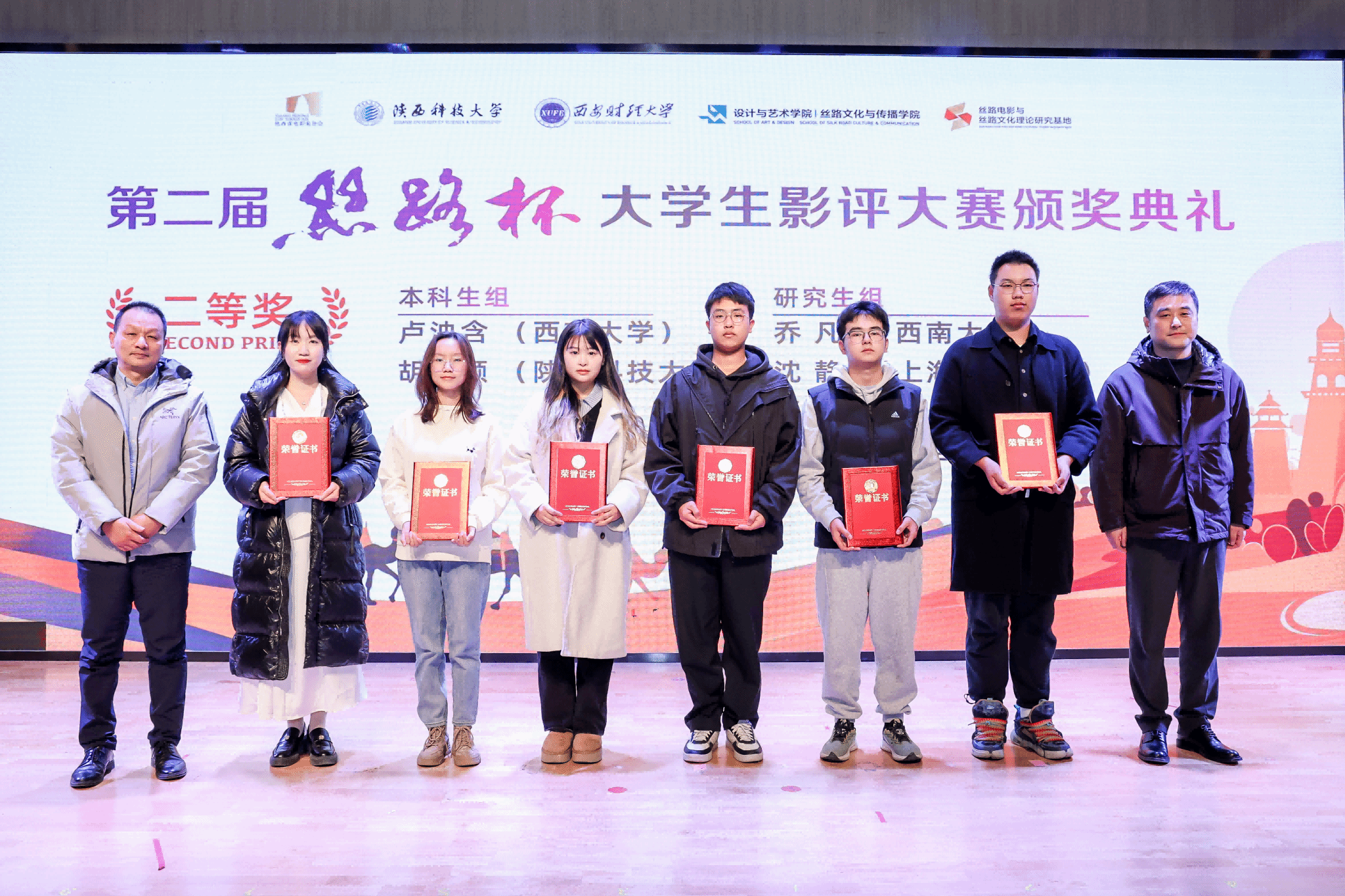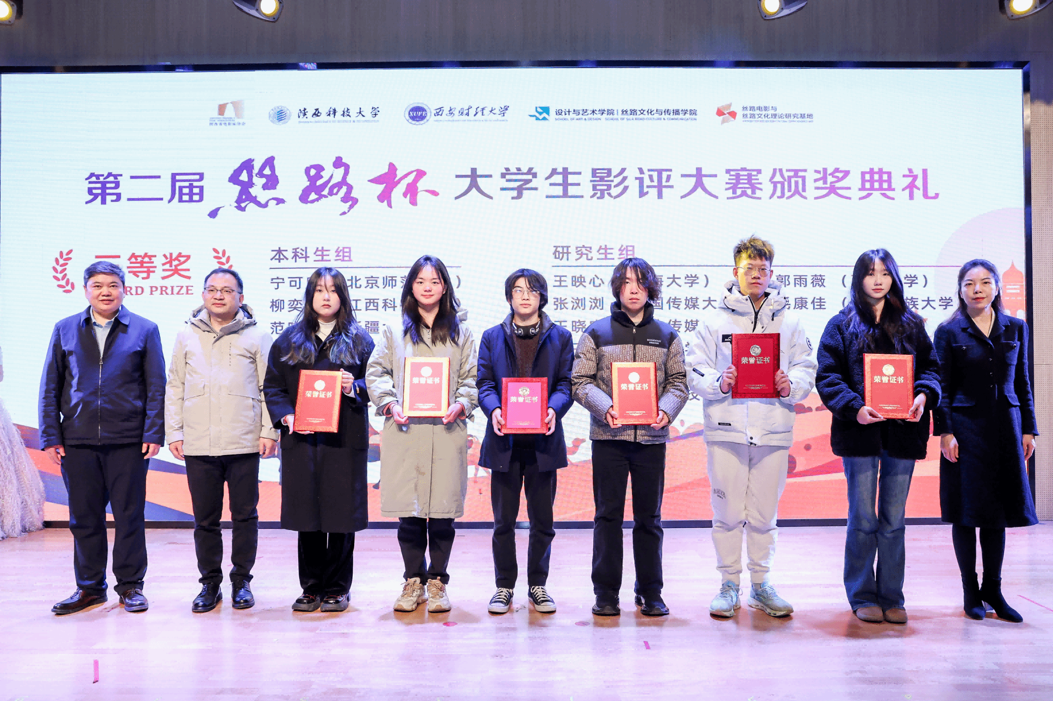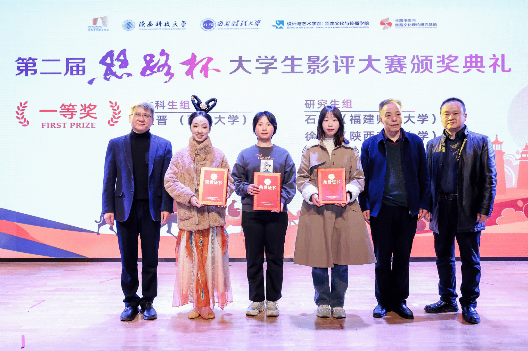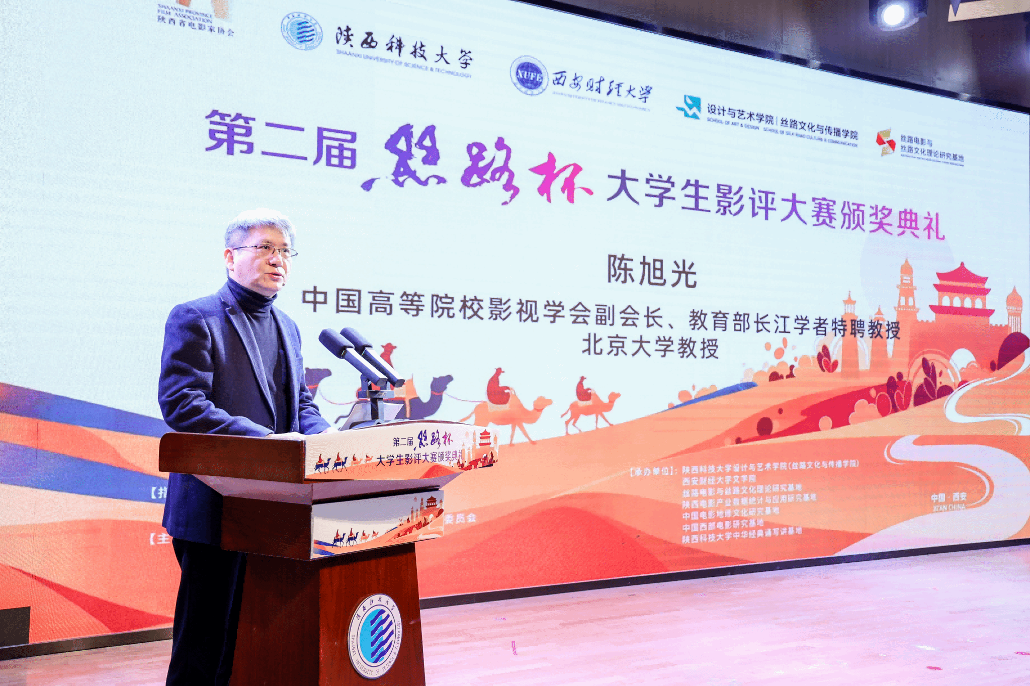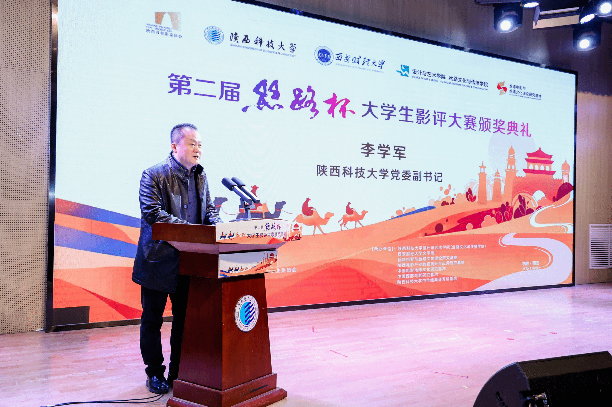 12月17日下午,“第二屆‘絲路杯’全國大學(xué)生影評大賽”頒獎(jiǎng)典禮在我校舉行。陜西科技大學(xué)黨委副書記李學(xué)軍,中國高等院校影視學(xué)會(huì)副會(huì)長、教育部長江學(xué)者特聘教授、北京大學(xué)教授陳旭光,西安財(cái)經(jīng)大學(xué)副校長傅彤、中共陜西省委宣傳部電影處副處長李曉楠,西安曲江影視集團(tuán)總經(jīng)理李珂,陜西省電影家協(xié)會(huì)副主席張東靈等出席并頒獎(jiǎng)。