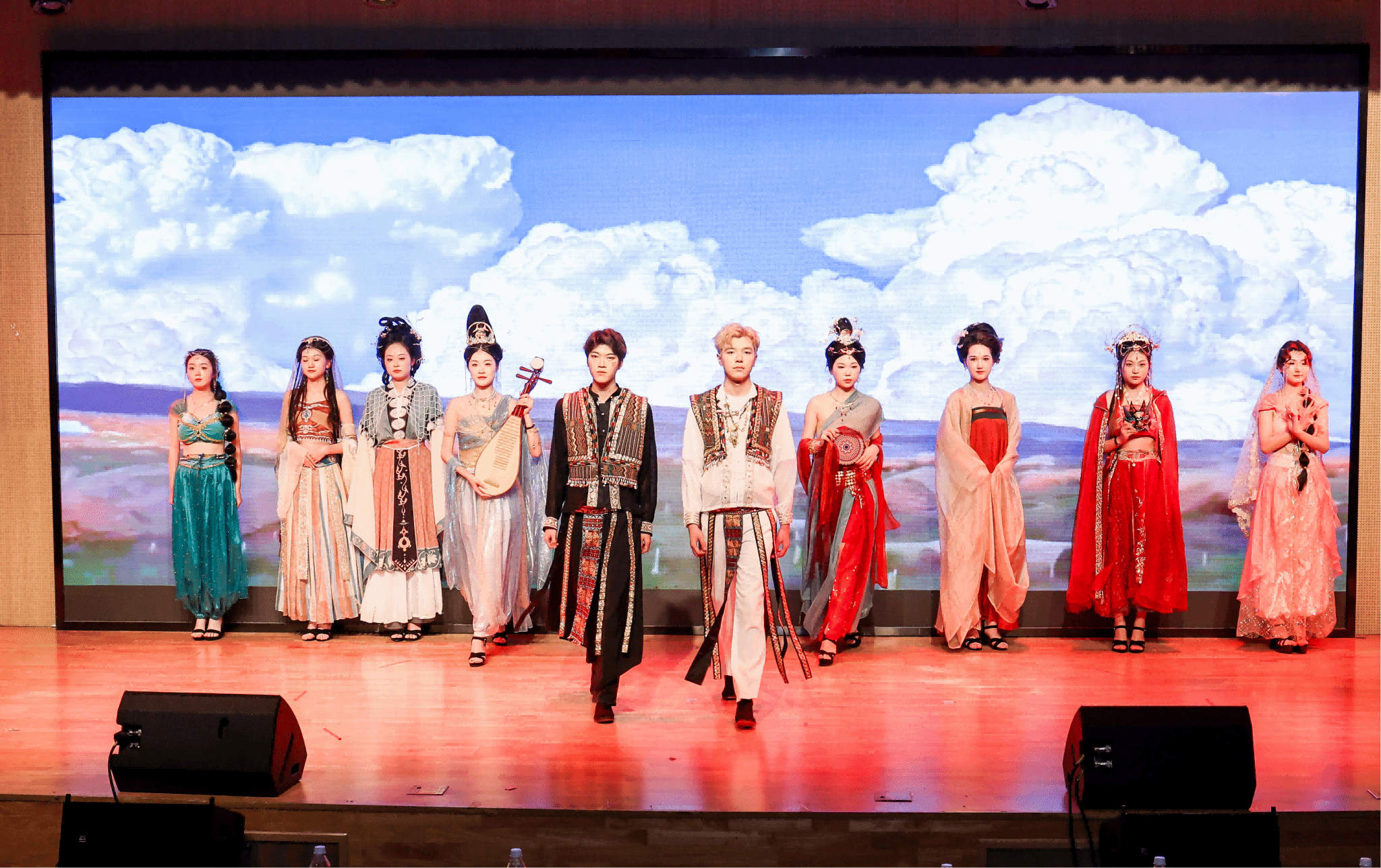 頒獎(jiǎng)典禮分為四個(gè)篇章,以開場舞《盛世》拉開序幕,現(xiàn)場播放了我校學(xué)生剪輯的短片:《沙漠綠洲絲綢之路》《草原·雪原絲綢之路》《海上絲綢之路》《西南絲綢之路》,這四個(gè)短片分別選取了絲綢之路題材影視歷史發(fā)展過程中的四個(gè)重要地理區(qū)位,用極具代表性的影視片段合成生動(dòng)地展示了絲綢之路的輝煌與歷史發(fā)展脈絡(luò)。受邀參加此次頒獎(jiǎng)典禮的領(lǐng)導(dǎo)嘉賓分別為優(yōu)秀獎(jiǎng)、優(yōu)秀指導(dǎo)教師、優(yōu)秀組織獎(jiǎng)、三等獎(jiǎng)、二等獎(jiǎng)、一等獎(jiǎng)等獲獎(jiǎng)同學(xué)、教師及單位頒發(fā)榮譽(yù)證書并合影留念。此外我校設(shè)計(jì)與藝術(shù)學(xué)院的學(xué)生表演了獨(dú)舞《絲路幻影》、模特走秀《絲綢之路萬里行》、朗誦《千年一路,絲綢榮光》等精彩節(jié)目,為現(xiàn)場觀眾帶來了一場極致的視聽盛宴,整場頒獎(jiǎng)典禮以豐富的藝術(shù)形式呈現(xiàn)了絲路文化獨(dú)特的藝術(shù)魅力,贏得了現(xiàn)場觀眾熱烈的掌聲。