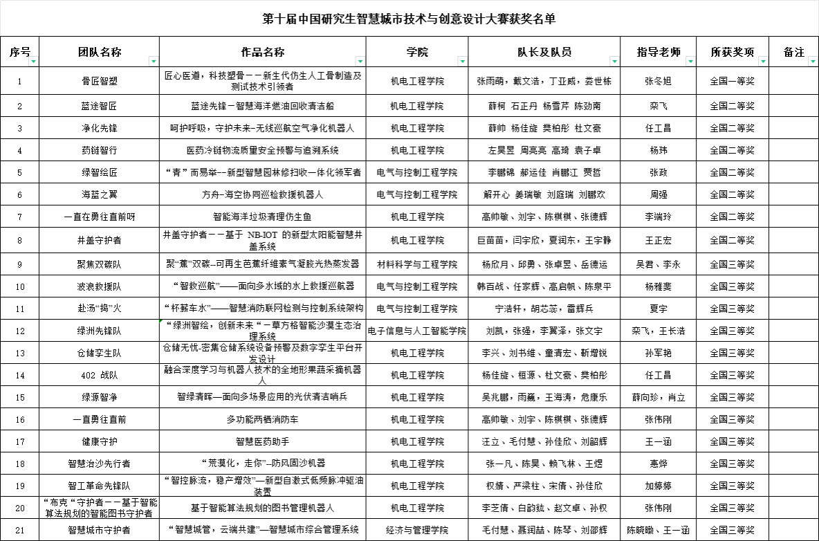 12月11日至13日,由教育部學(xué)位管理與研究生教育司指導(dǎo)、中國學(xué)位與研究生教育學(xué)會(huì)和中國科協(xié)青少年科技中心聯(lián)合主辦的第十屆中國研究生智慧城市技術(shù)與創(chuàng)意設(shè)計(jì)大賽決賽在重慶大學(xué)舉行。我校參賽隊(duì)伍經(jīng)過激烈比拼,最終有21項(xiàng)作品榮獲國家級(jí)獎(jiǎng)項(xiàng),其中1項(xiàng)作品榮獲全國一等獎(jiǎng),7項(xiàng)作品榮獲全國二等獎(jiǎng),13項(xiàng)作品榮獲全國三等獎(jiǎng),獲獎(jiǎng)等級(jí)和數(shù)量均創(chuàng)歷史新高。學(xué)校榮獲高校優(yōu)秀組織單位獎(jiǎng),機(jī)電工程學(xué)院張冬旭獲優(yōu)秀指導(dǎo)教師稱號(hào)。