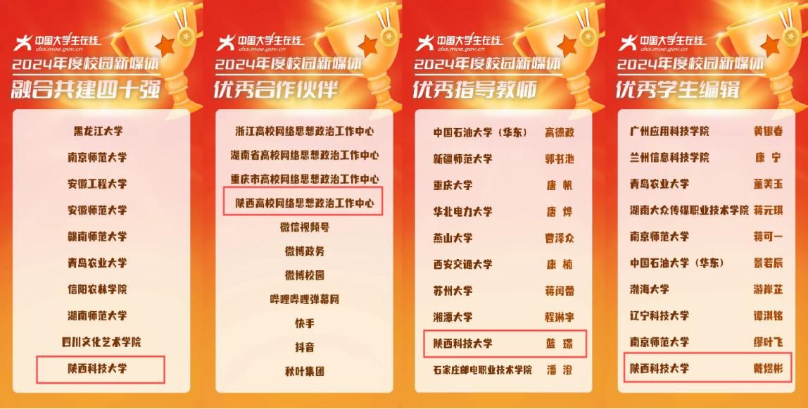 作為陜西高校網(wǎng)絡(luò)思想政治工作中心承建高校,我校積極推動(dòng)全省高校與“中國(guó)大學(xué)生在線”的共建工作,在本次發(fā)布的表彰名單中,陜西高校累計(jì)斬獲國(guó)家級(jí)獎(jiǎng)項(xiàng)30項(xiàng),創(chuàng)歷史新高,陜西高校網(wǎng)絡(luò)思想政治工作中心榮獲“2024年度校園新媒體優(yōu)秀合作伙伴”稱號(hào)。