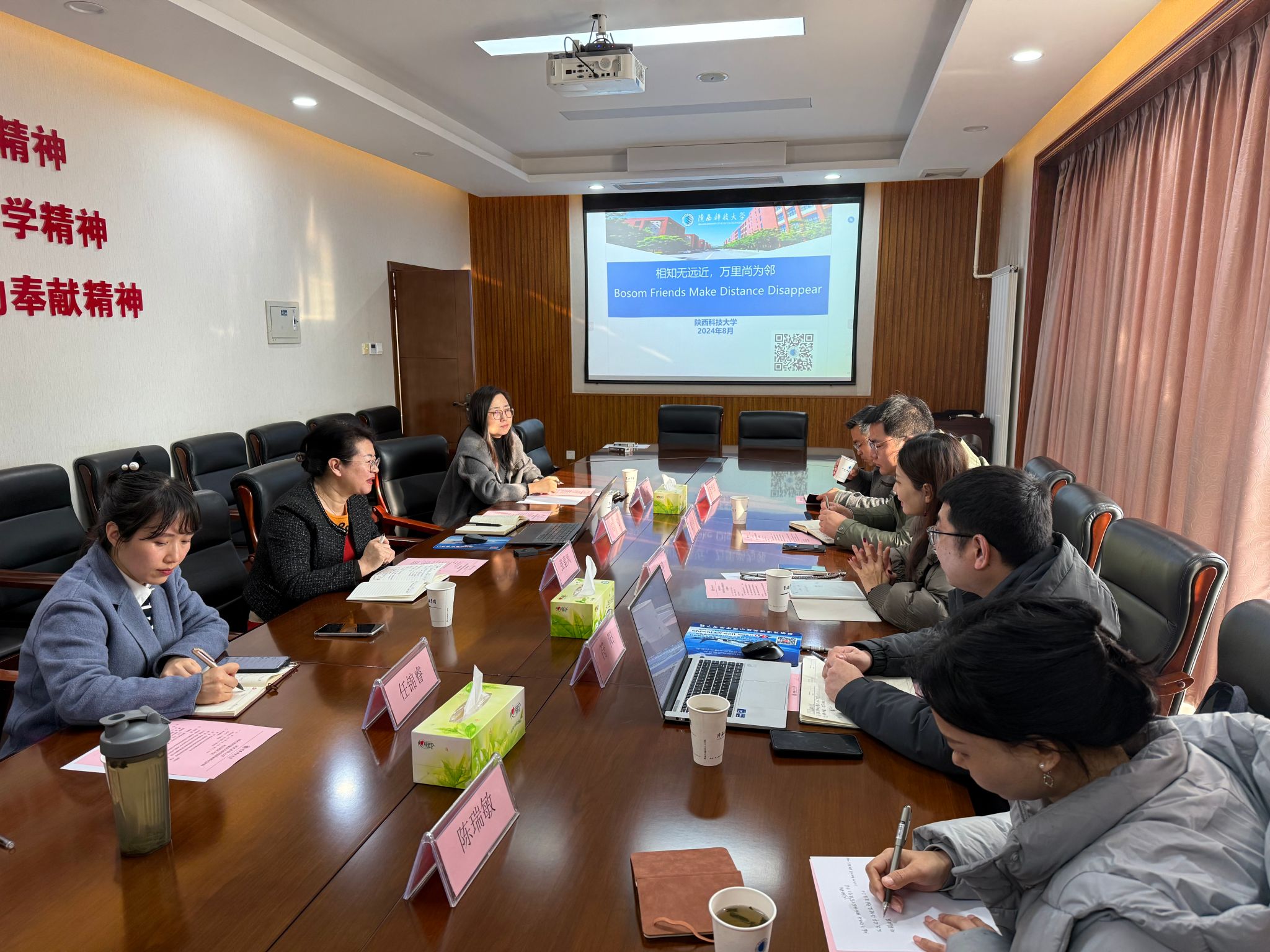 在國(guó)際處交流座談中,國(guó)際處處長(zhǎng)張素風(fēng)對(duì)韓萍副局長(zhǎng)一行的來訪表示歡迎,并介紹了陜西科技大學(xué)國(guó)際化辦學(xué)特色及近年國(guó)際交流合作成果,并表示學(xué)校積極響應(yīng)國(guó)家“一帶一路”倡議,通過國(guó)際聯(lián)合科研、學(xué)術(shù)互訪、國(guó)際學(xué)術(shù)會(huì)議等形式持續(xù)拓展合作網(wǎng)絡(luò),為校地高質(zhì)量發(fā)展注入國(guó)際化動(dòng)能。韓萍副局長(zhǎng)對(duì)學(xué)校國(guó)際科技工作做出了積極肯定,并詳細(xì)介紹了西咸新區(qū)在推進(jìn)國(guó)際科技創(chuàng)新交流合作中的重點(diǎn)舉措及政策支持體系,給出了雙方開展國(guó)際科技合作的路徑建議,同時(shí)表示將積極搭建校企產(chǎn)學(xué)研合作平臺(tái),推進(jìn)雙方更深層次合作。