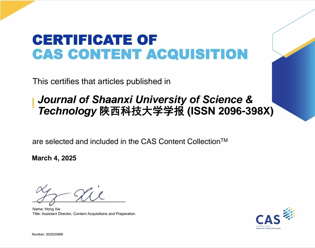 2025年3月4日,《陜西科技大學學報》在經(jīng)過前期申報及美國化學文摘社(Chemical Abstracts Service,CAS)的多輪嚴格評估后,最終被全球權威數(shù)據(jù)庫美國化學文摘(Chemical Abstracts, CA)正式收錄。這是本刊繼被《俄羅斯文摘雜志》(AJ)、《英國食品科技文摘》(FSTA)、《美國艾博思科全文數(shù)據(jù)庫》(EBSCOhost)、《美國烏利希國際期刊指南》(UPD)等大型國際數(shù)據(jù)庫收錄后,再次被國際知名數(shù)據(jù)庫收錄。將進一步提升《陜西科技大學學報》的期刊國際影響力,拓寬加深學報論文的國際傳播廣度和深度。