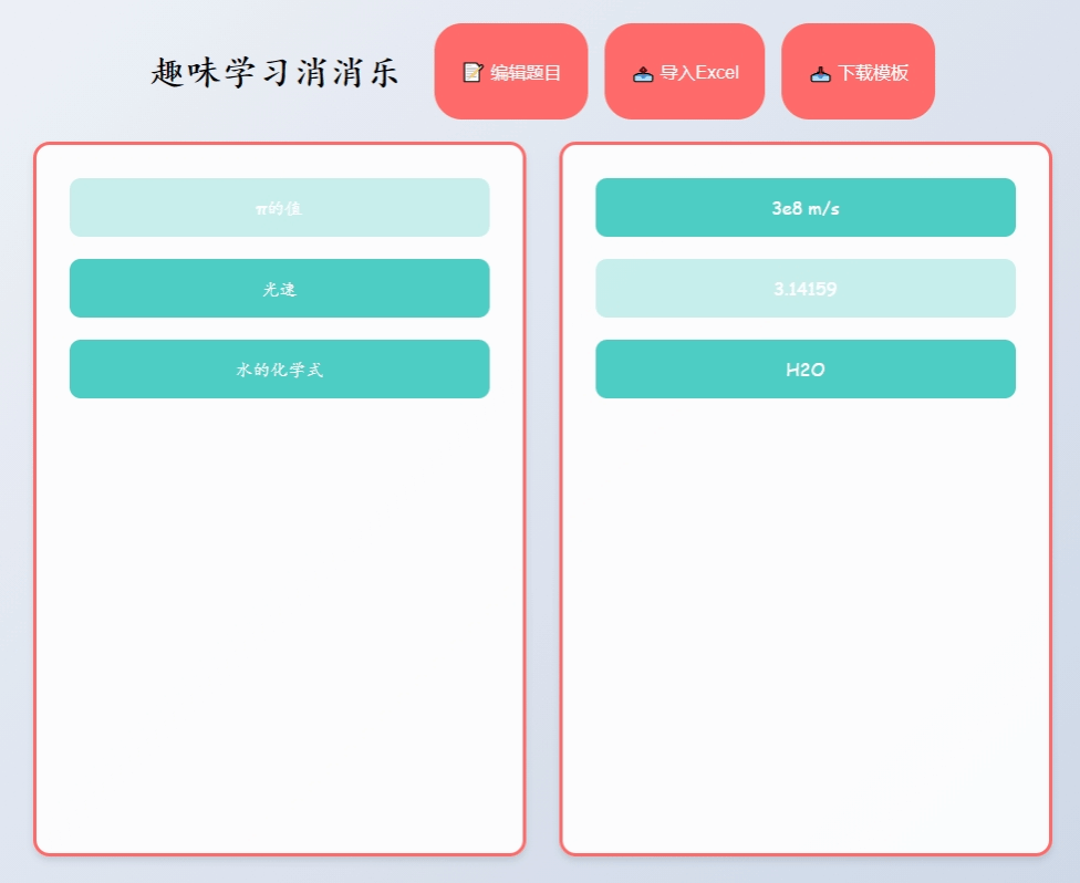 “趣味消消樂”提示詞:幫我制作一個針對學(xué)習(xí)的連連看游戲網(wǎng)頁,淺色背景。分左右兩列,左邊一列為問題,右邊一列為答案,左右選擇正確后消除,且左邊問題和右邊答案亂序排列。問題和答案提供一個可編輯頁面供老師編輯問題和答案。同時,也提供下載的excel模板,有導(dǎo)入excel按鈕功能。