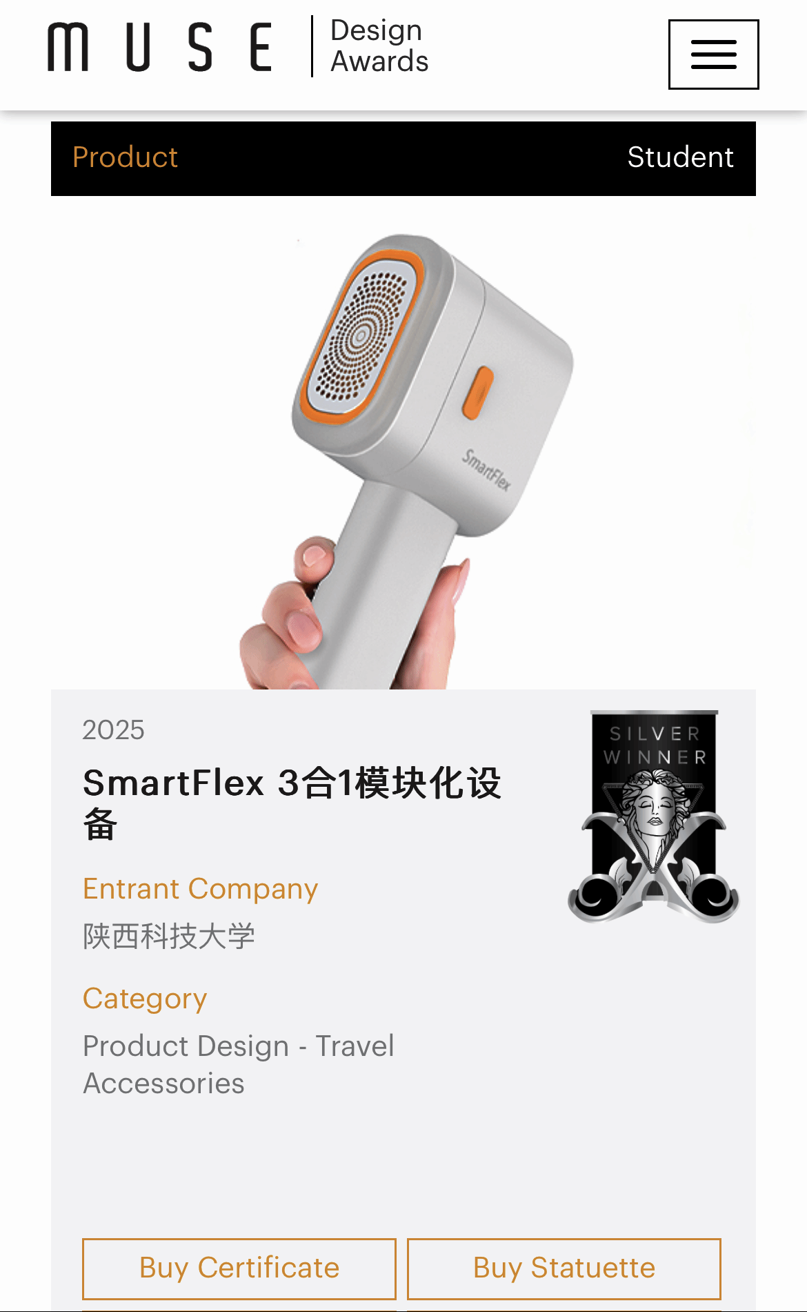 近日,2025美國MUSE國際設(shè)計(jì)獎(jiǎng)組委會(huì)發(fā)來喜報(bào),由我校設(shè)計(jì)與藝術(shù)學(xué)院(絲路文化與傳播學(xué)院)工業(yè)設(shè)計(jì)系教師江濤指導(dǎo),學(xué)生李嘉儀(22級工業(yè)設(shè)計(jì))設(shè)計(jì)的作品《SmartFlex 3合1模塊化設(shè)備》(SmartFlex 3-in-1 Modular Appliance)從全球100多個(gè)國家數(shù)萬件參賽作品中脫穎而出,榮獲產(chǎn)品設(shè)計(jì)組銀獎(jiǎng)。