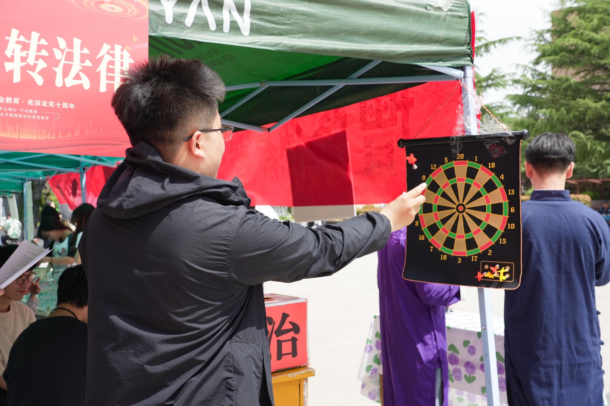 智慧普法激發(fā)參與熱潮。“法典投鏢”競技區(qū)將法律知識與趣味游戲結(jié)合,飛鏢投鏢解鎖憲法知識關(guān)卡,“法治飛花令”擂臺賽上,學(xué)子們妙語連珠對出百余條法治金句。線上打造的“云端課堂”通過抖音平臺直播觀看人數(shù)超過萬人,易班平臺互動(dòng)專區(qū)參與討論人數(shù)突破五千人次。