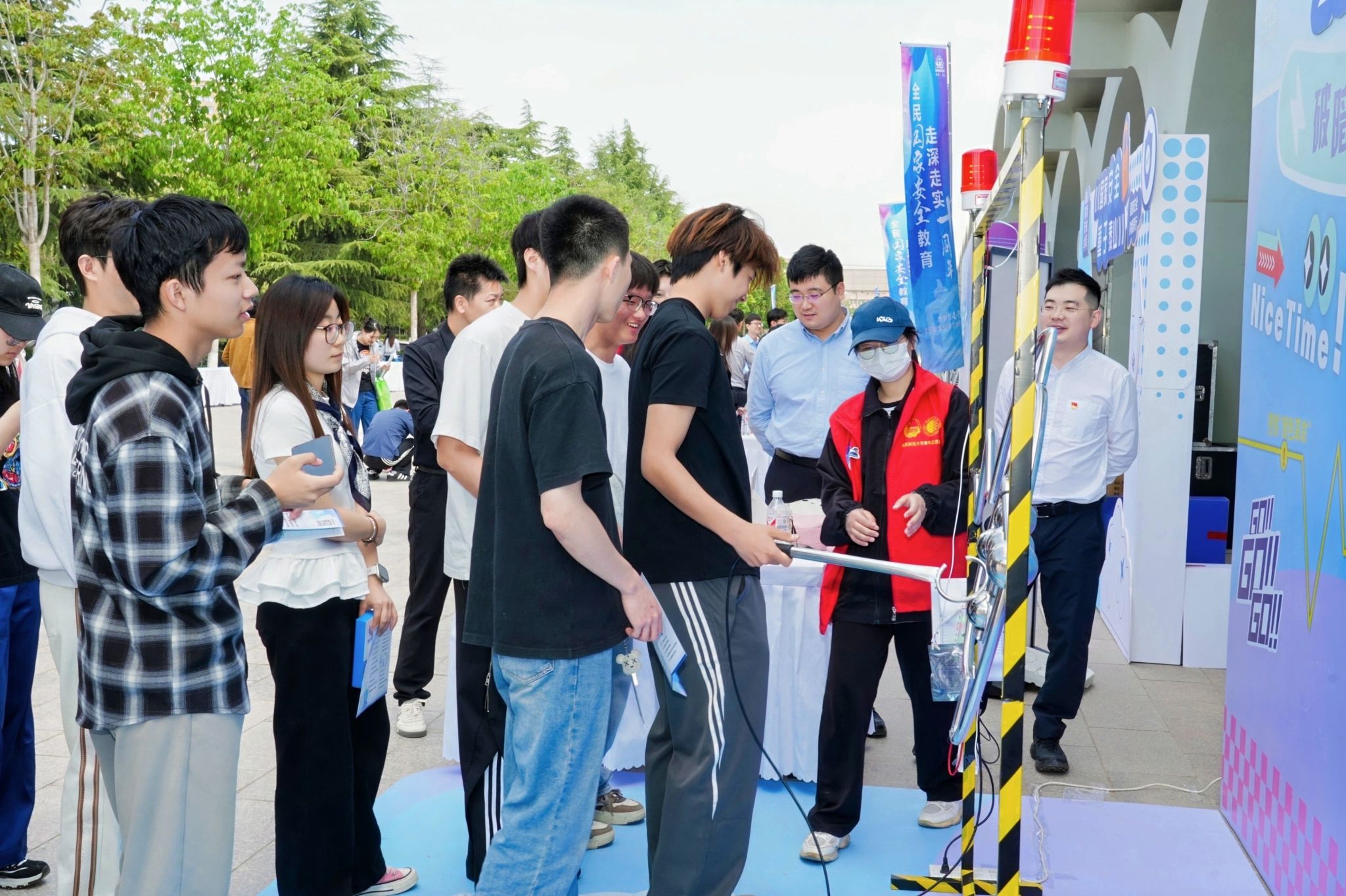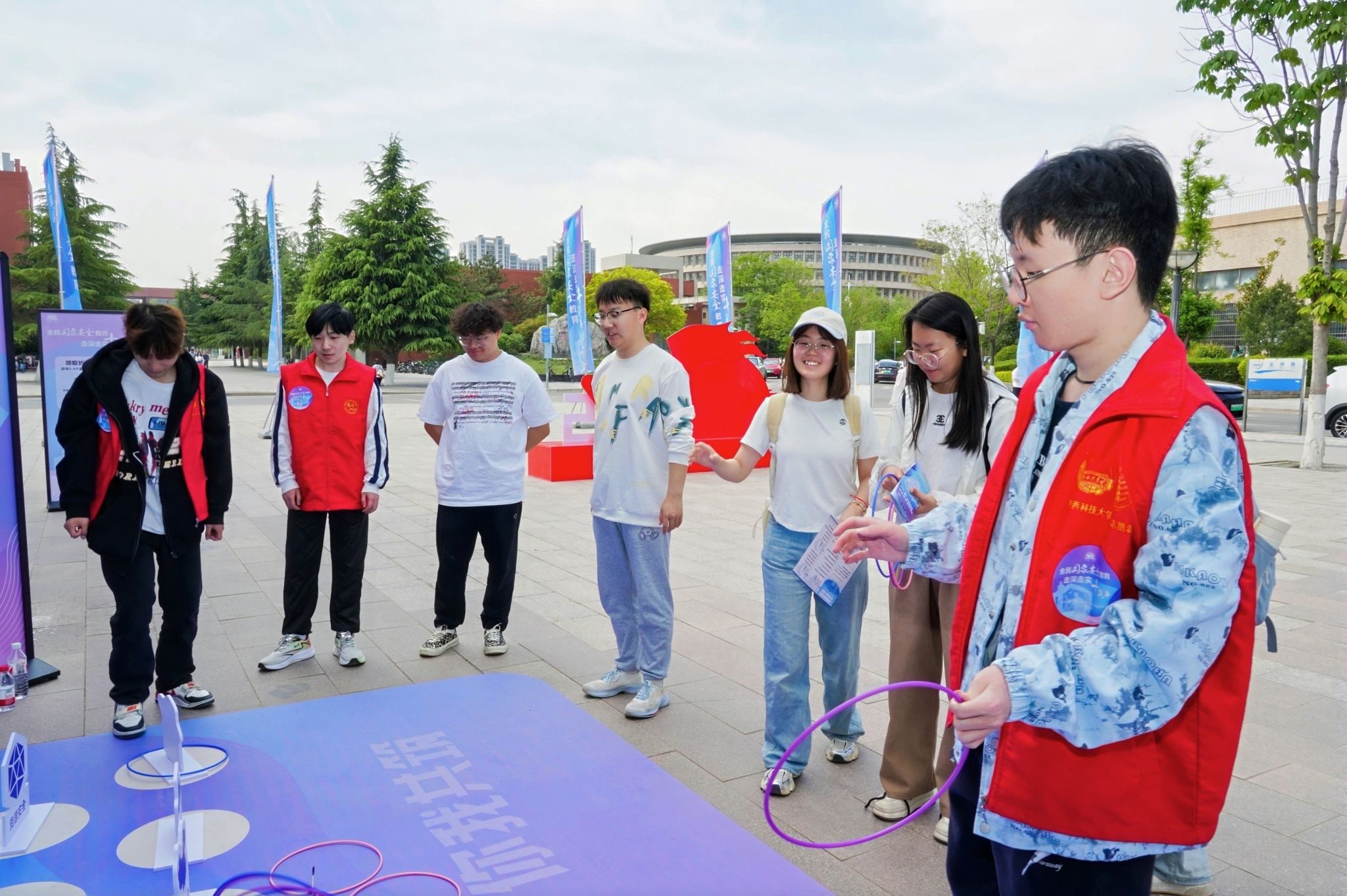 活動現(xiàn)場宣傳學(xué)習(xí)氣氛熱烈,現(xiàn)場設(shè)置了主題展板、趣味互動、咨詢答疑三大板塊,內(nèi)容豐富、形式多樣,向師生們展示了國家安全的豐富內(nèi)涵和重要意義。趣味互動區(qū)域更是人氣爆棚,“套圈挑戰(zhàn)”“障礙闖關(guān)”等游戲?qū)⒄?、網(wǎng)絡(luò)、數(shù)據(jù)等安全重點領(lǐng)域知識轉(zhuǎn)化為可觸可感的實踐場景,學(xué)生通過集章兌換國家安全主題文創(chuàng),在寓教于樂中樹牢風(fēng)險防范意識。