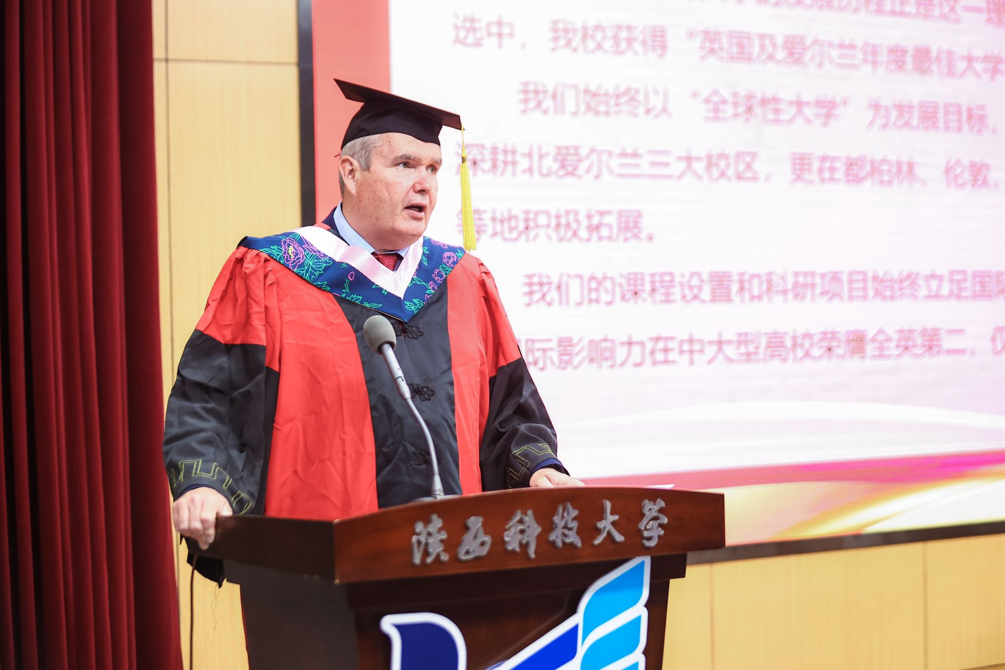 Christopher Wigginton在致辭中對陜西科技大學(xué)在中外合作辦學(xué)事業(yè)發(fā)展中給予的支持表示感謝,并向2025屆畢業(yè)生圓滿完成學(xué)業(yè)表示祝賀。他寄語畢業(yè)生要秉持合作精神,加入全球校友網(wǎng)絡(luò),以全球視野規(guī)劃職業(yè)生涯,攜手為推動世界經(jīng)濟(jì)社會發(fā)展作出貢獻(xiàn)。