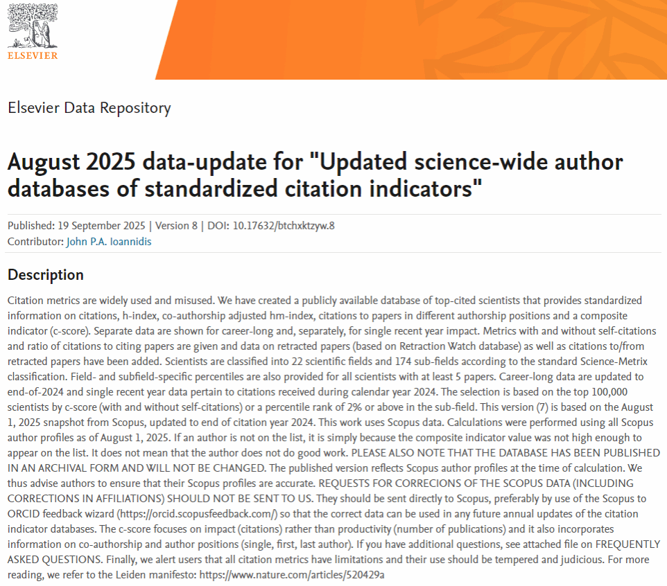 全球前2%頂尖科學(xué)家榜單基于Scopus數(shù)據(jù)庫詳盡的引用數(shù)據(jù)分析,通過綜合考慮論文被引次數(shù)、H指數(shù)、HM因子、單獨或第一作者的文章引用數(shù)等綜合指標(biāo),從全球近700萬名科學(xué)家中遴選出世界排名前2%的科學(xué)家,涵蓋22個領(lǐng)域和174個子領(lǐng)域。其中,“終身影響力”榜單統(tǒng)計科學(xué)家職業(yè)生涯期間的綜合表現(xiàn),“年度影響力”榜單則聚焦上一年度的學(xué)術(shù)影響力。