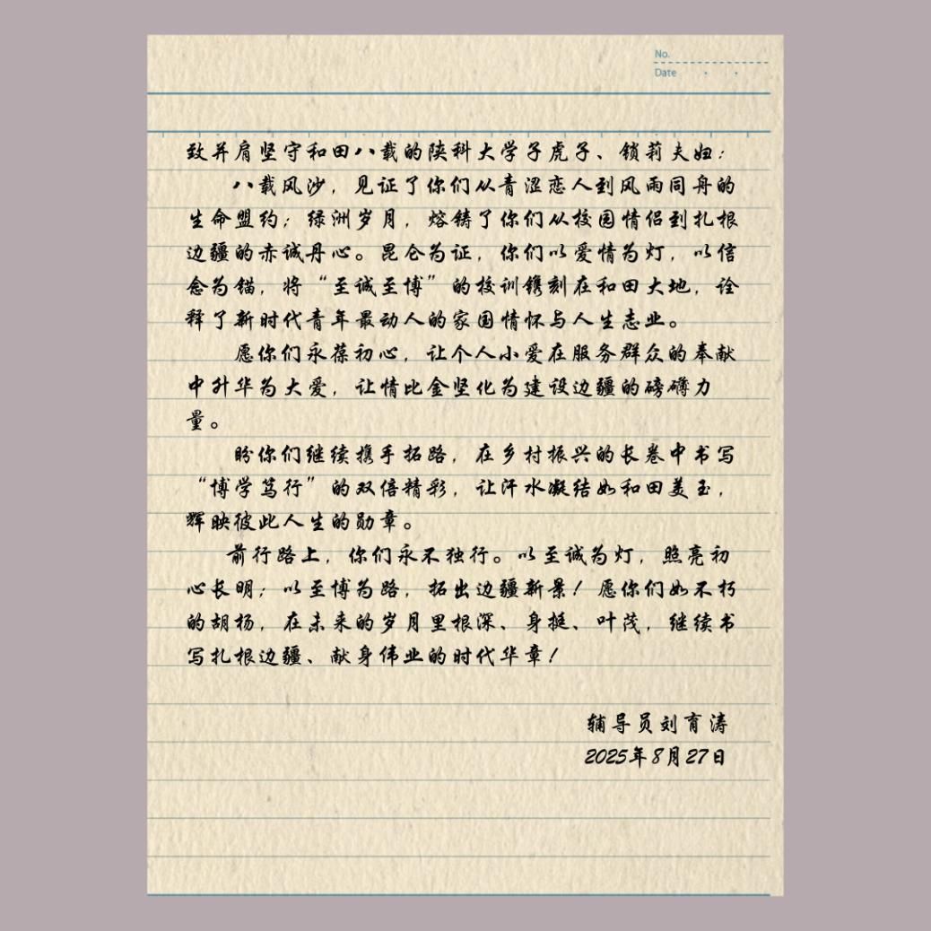 “渭水同窗,昆侖共守”,李虎與馮鎖莉的故事,未有驚天動地的壯闊波瀾,卻蘊藏著直抵人心的精神力量。這份力量,是伴侶間的相契與篤行——從陜西科技大學校園里的并肩求索,到和田邊疆的風雨同舟,他們以愛為舟楫,將小家的溫情揉進邊疆的日月,讓“相守”不再是單薄的承諾,而是浸潤在柴米油鹽與守望相助里的具象人生;是共產黨人的初心與擔當——以信念為錨點,扎根于塔克拉瑪干沙海之畔,在走村入戶的奔波、服務鄉(xiāng)親的瑣碎里,踐行著“到祖國最需要處去”的誓言,讓“奉獻”脫離空泛的口號,成為浸潤在每一次解民憂、紓民困中的實在行動;更是陜科大學子的赤誠與風骨——攜著對土地的敬畏、對責任的恪守,將青春的印記深深鐫刻在昆侖山腳下的熱土之上,讓“成長”不再是個人的踽踽獨行,而是與邊疆發(fā)展同頻共振的雙向奔赴。
